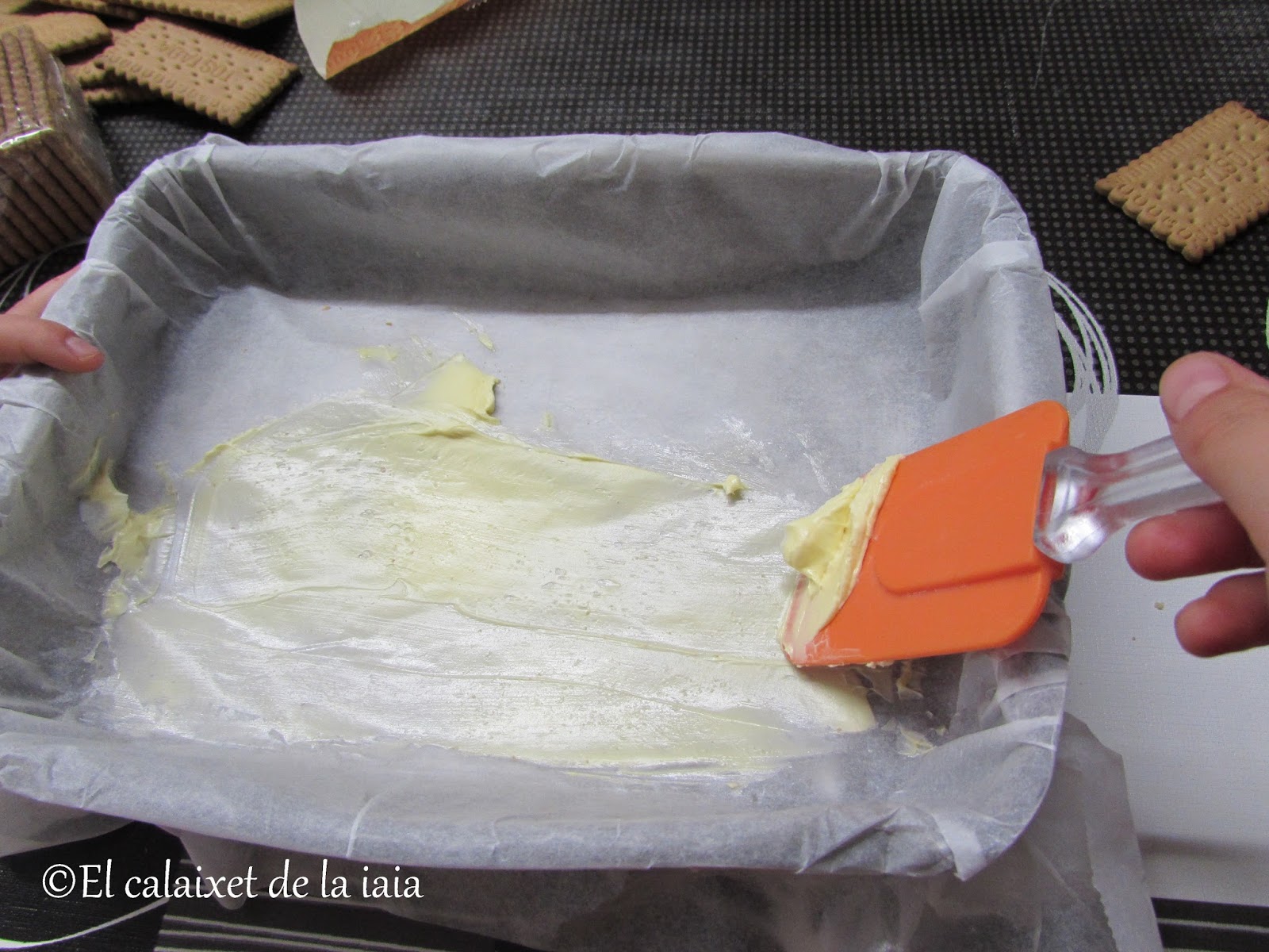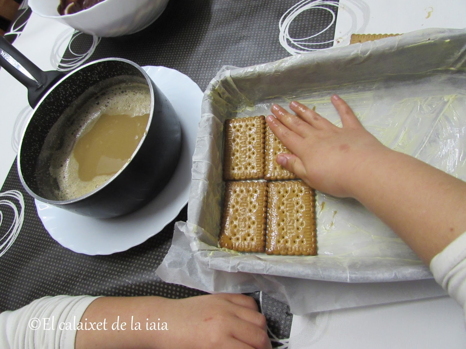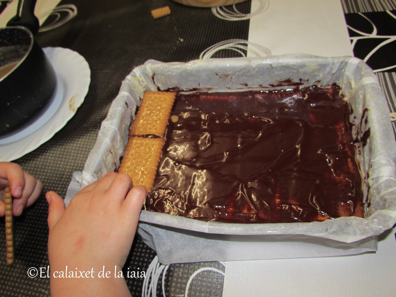 mientras hemos hecho éstos pasos, la leche ya estará sólo templada, iremos mojando las galletas sumergiendo en la leche y rápidamente iremos colocando una base en el molde. El proceso de mojado ha de ser muy rápido para que se empapen sólo lo justo y no se rompan