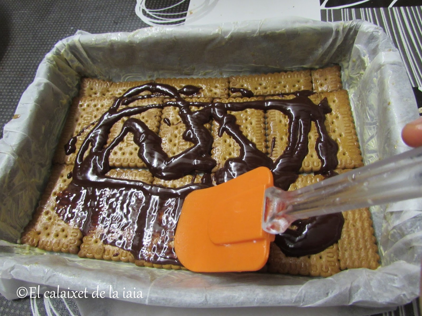 En cuanto tengamos la primera capa de galletas cubriremos con la crema o ganaché de chocolate