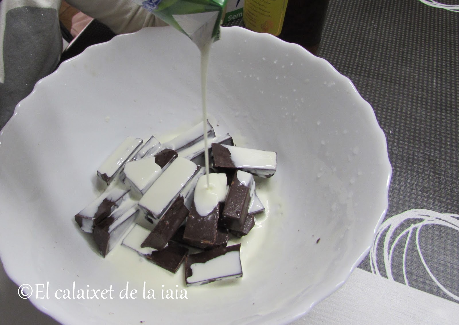 Añadiremos la misma cantidad de nata para montar que de chocolate, y calentaremos al microondas sólo lo suficiente para derretir el chocolate, removiendo la nata tibia