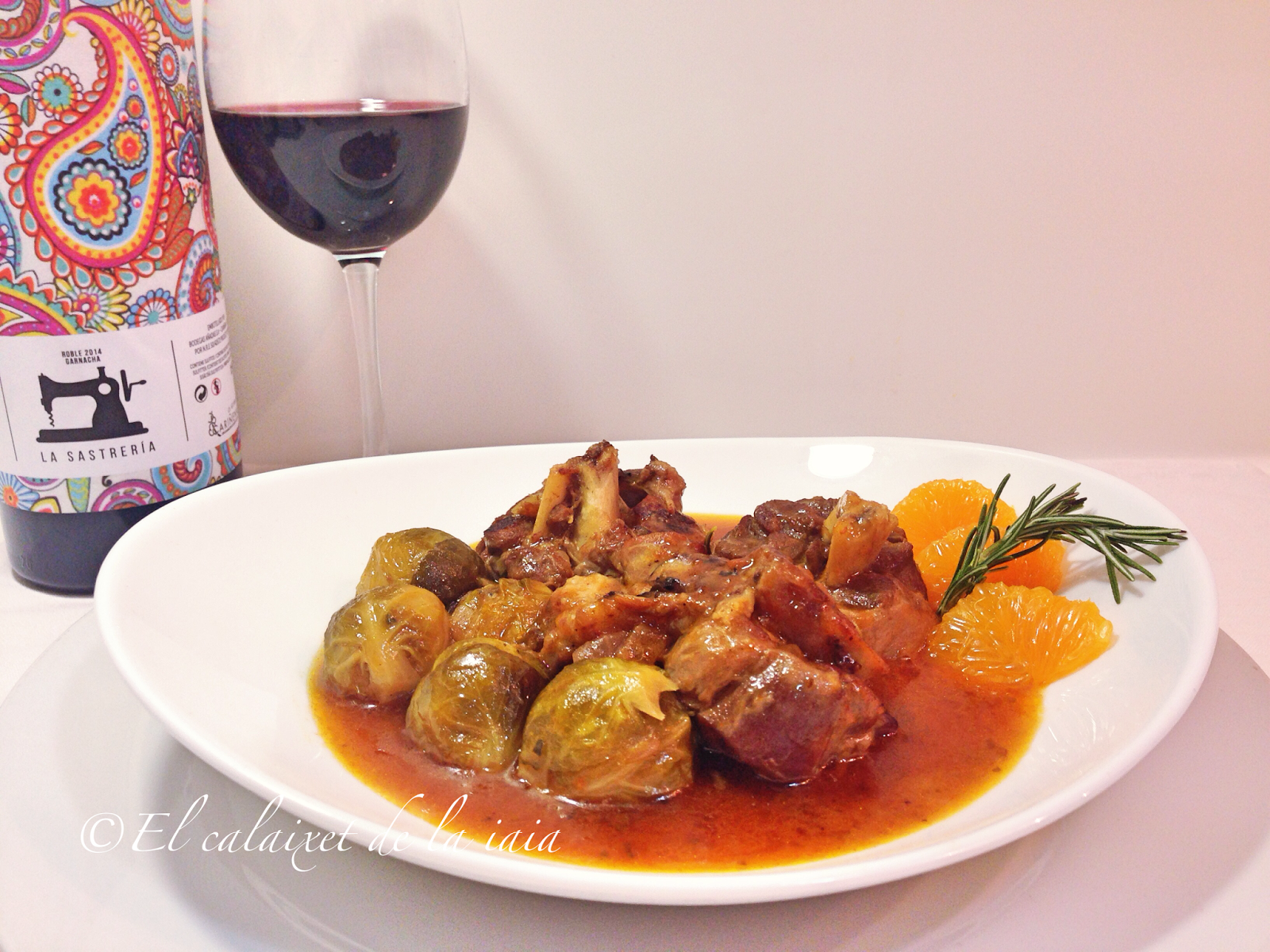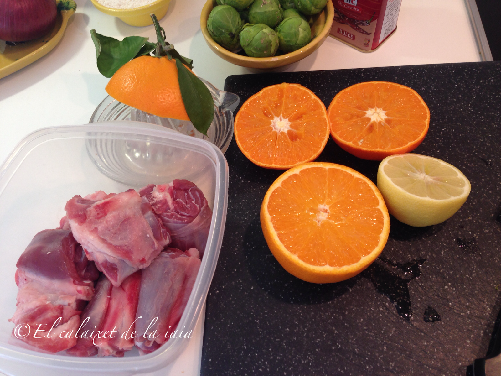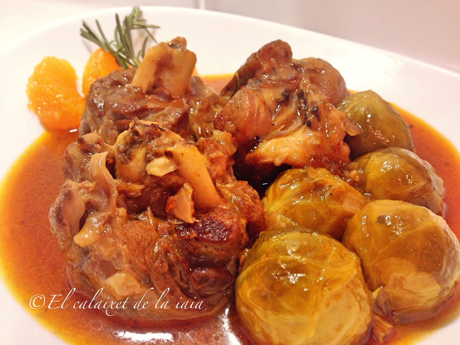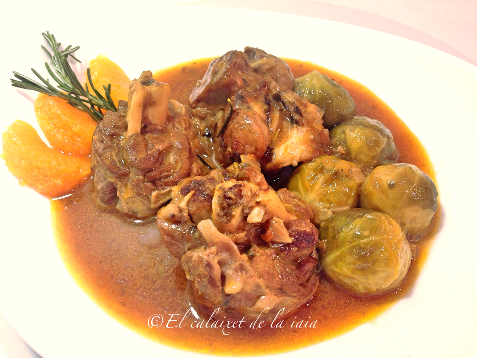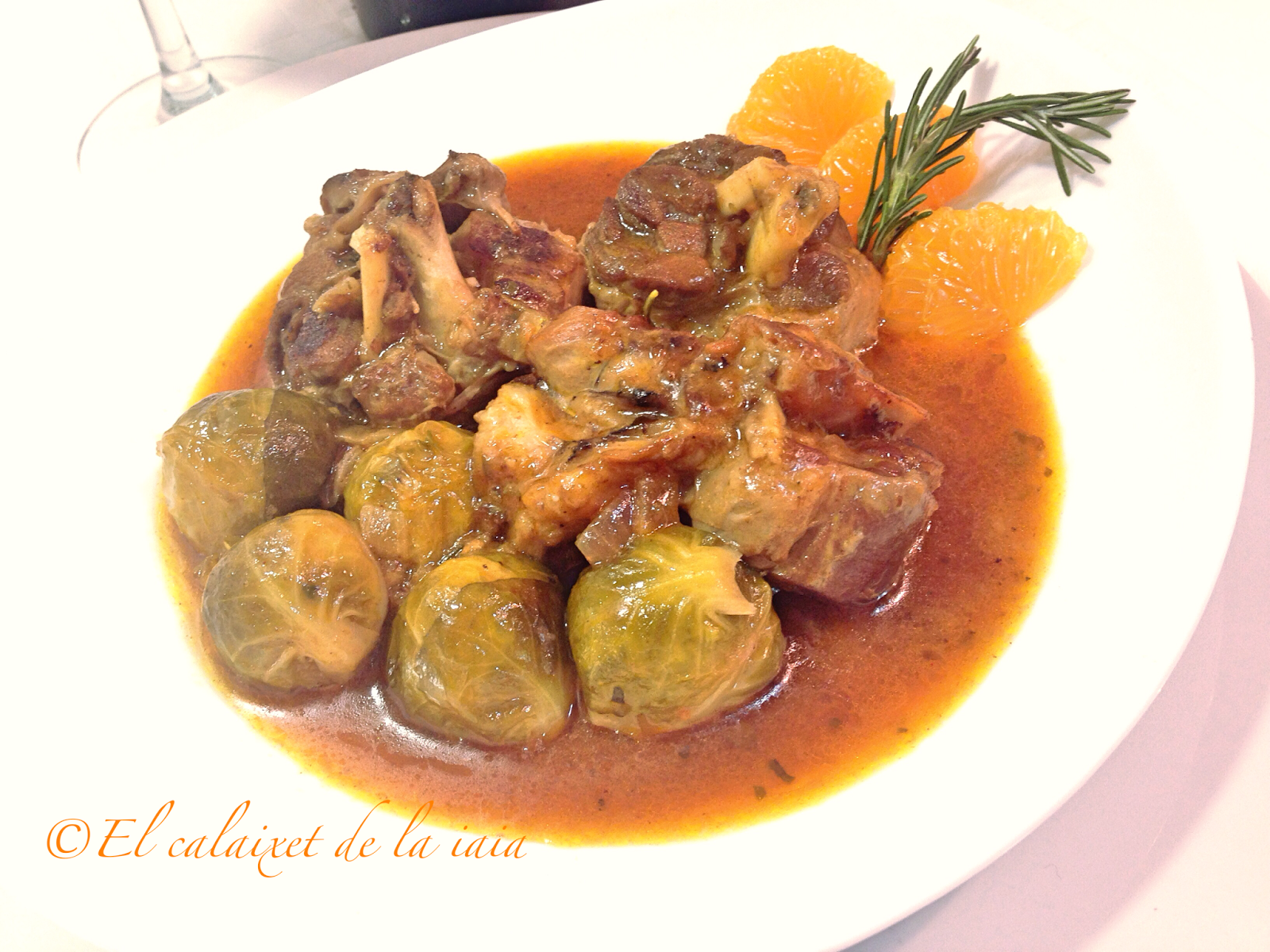 Tuvimos que bajarnos del pueblo a toda prisa por un problema de salud, el mismo día que recibí ésta preciosidad de cesta de naranjas, y ya había sacado del arcón congelador (en el pueblo no hay comercio alguno donde comprar NADA) unas garretas de cordero. Hemos llegado del hospital, y como estamos los dos solos para dos tengo bastante, unas coles de bruselas y alguna otra verdura que hay en el frigo… voy a preparar para comer mañana, un plato especial para celebrar que hemos superado otros dos sustos más, y en honor de naranjas LU.