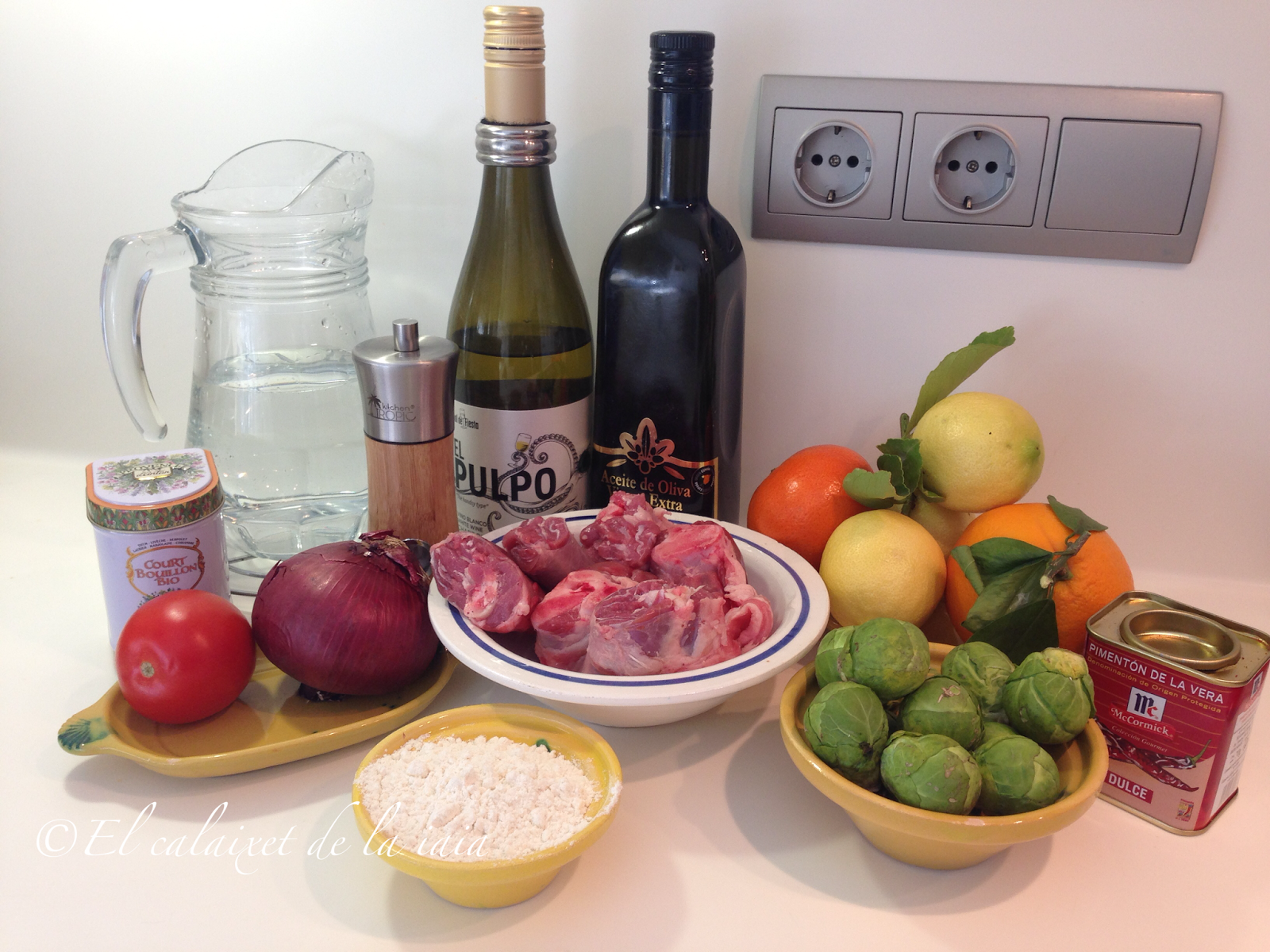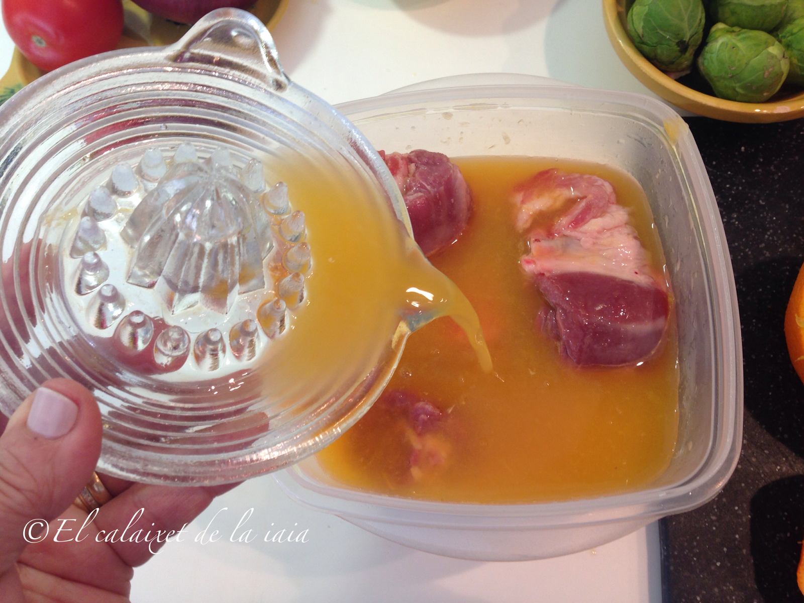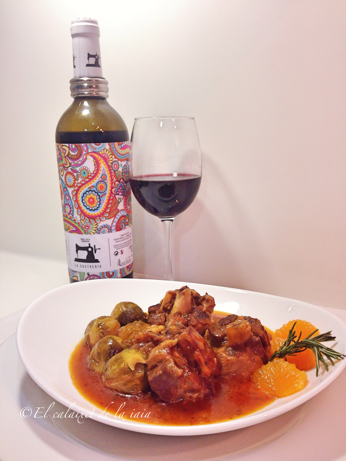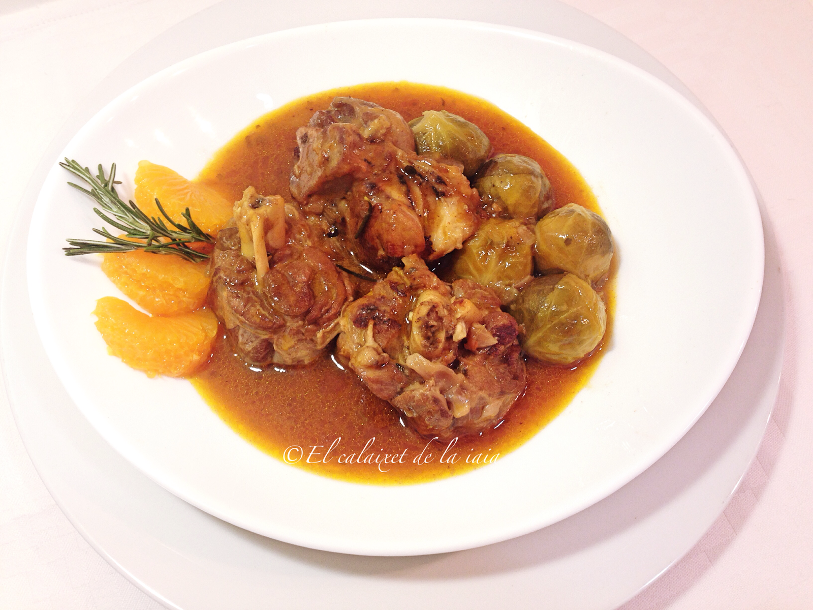 Tuvimos que bajarnos del pueblo a toda prisa por un problema de salud, el mismo día que recibí ésta preciosidad de cesta de naranjas, y ya había sacado del arcón congelador (en el pueblo no hay comercio alguno donde comprar NADA) unas garretas de cordero. Hemos llegado del hospital, y como estamos los dos solos para dos tengo bastante, unas coles de bruselas y alguna otra verdura que hay en el frigo… voy a preparar para comer mañana, un plato especial para celebrar que hemos superado otros dos sustos más, y en honor de naranjas LU.