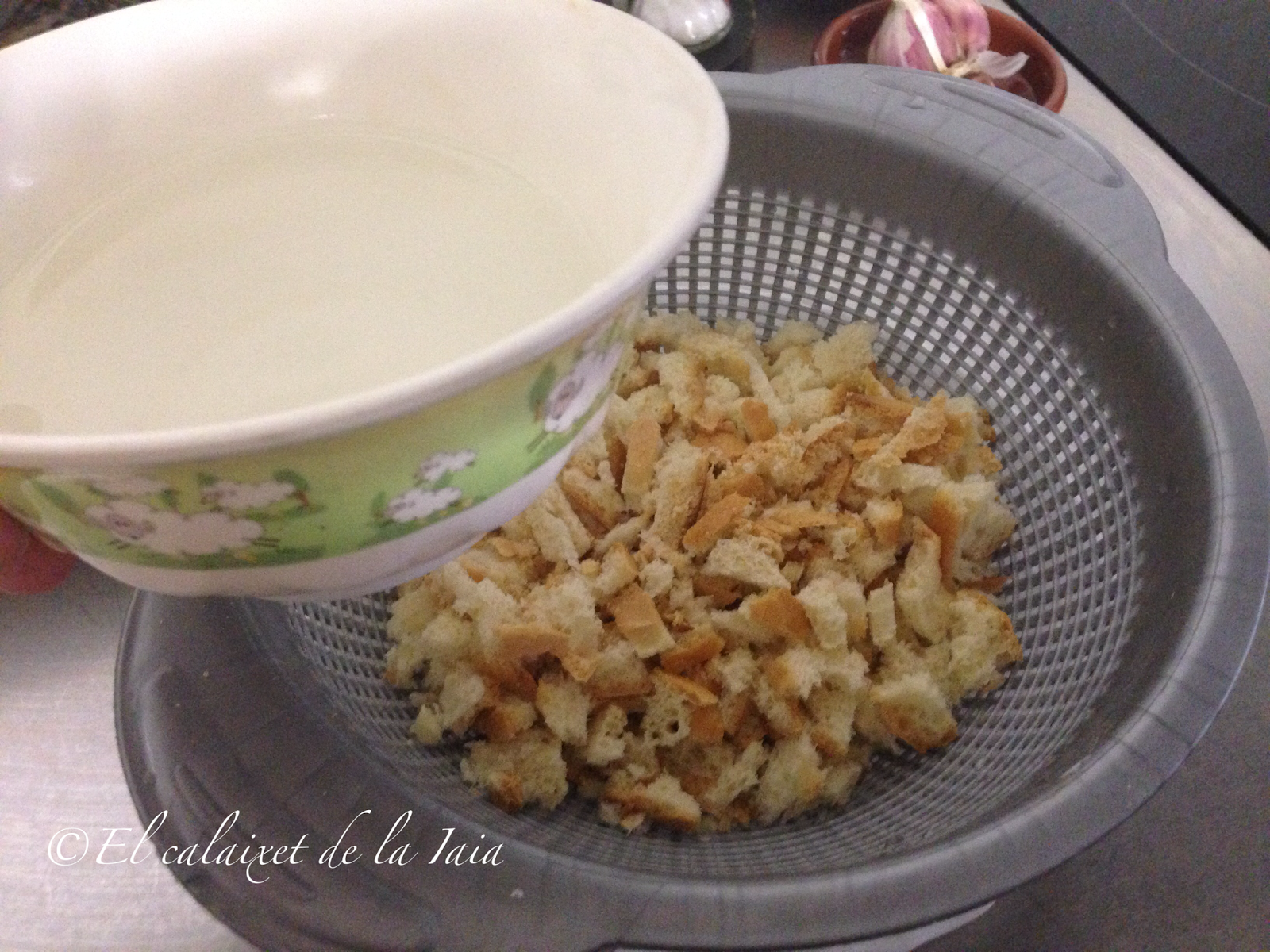 cortaremos la rebanadas en trozos pequeños, los colocaremos en un escurridor e iremos salpicándolas con el agua, hasta poner unos 100ml. ya que sólo han de estar húmedas, pero no empapadas