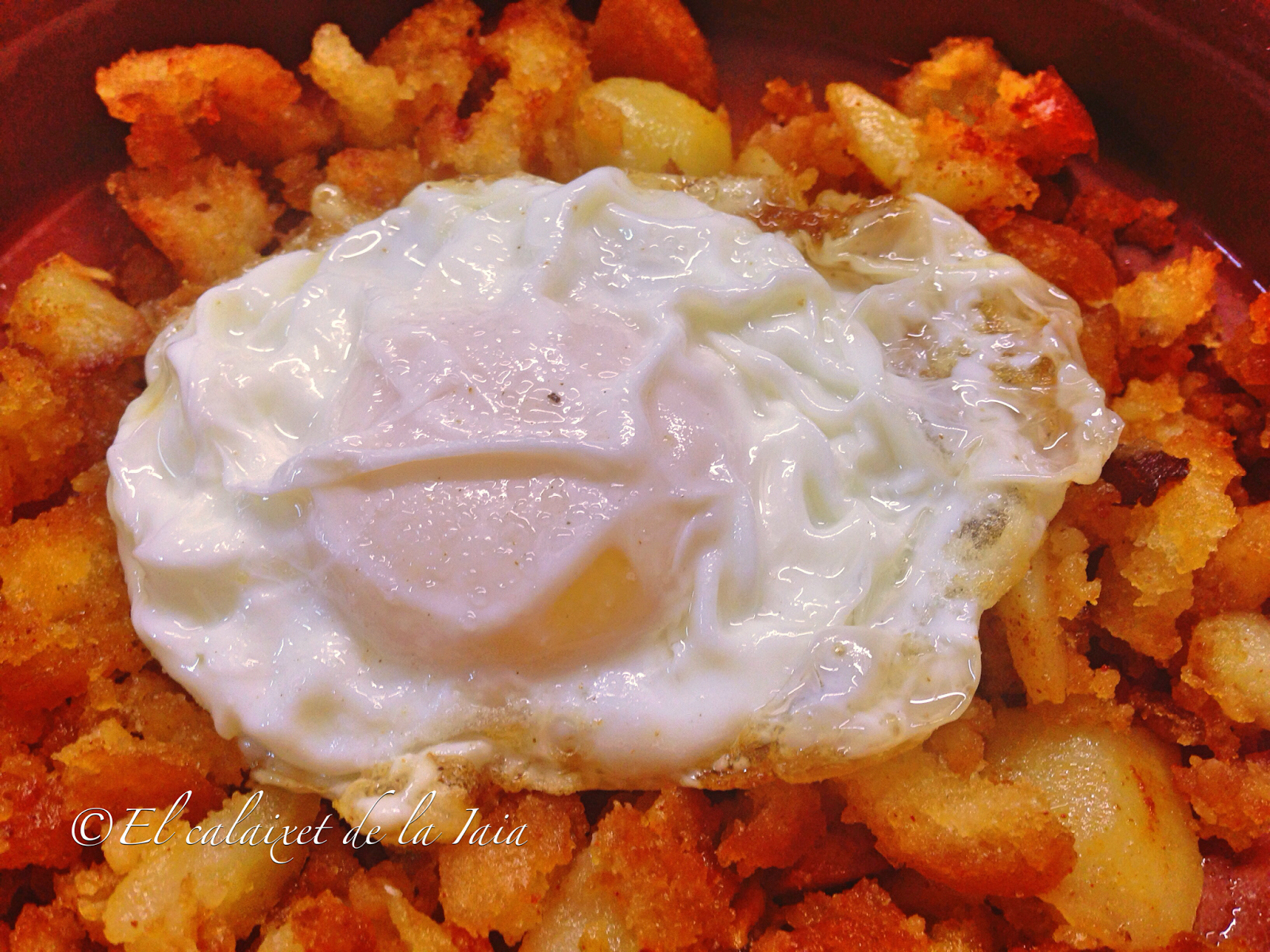 aunque falta coronar nuestro plato con un riquísimo huevo frito con puntilla. En éste caso, mis huevos también son maños y caseros, huevos serranos, con color de yema distinto de gallinas «pollitas» criadas en la sierra,