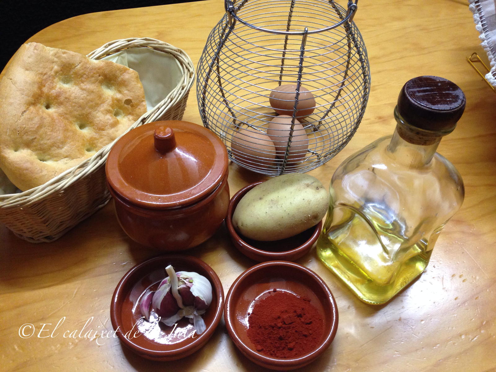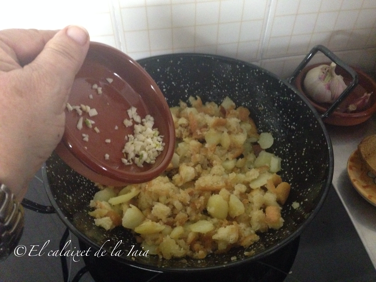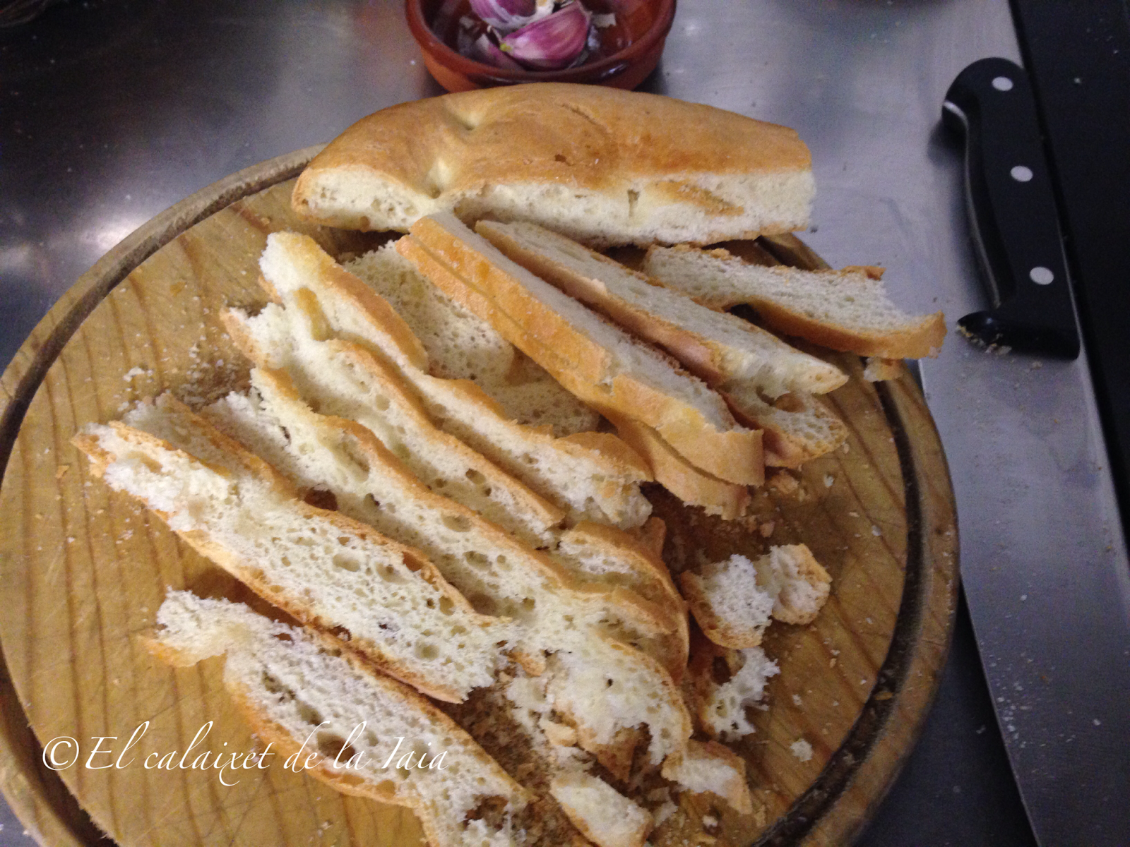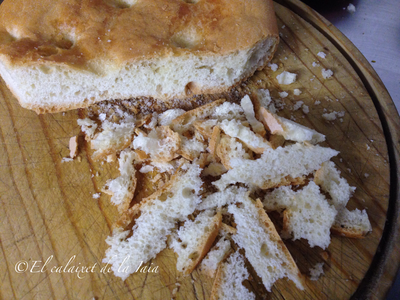 Lo ideal es usar pan de pueblo, en ésta ocasión he usado una «blandilla» que es como se denomina en el pueblo de mi marido al pan chato de aceite, que en otros pueblos llaman «cañada», y que nos gusta mucho comer, pero podéis usar cualquier pan que tenga ya dos o tres días.