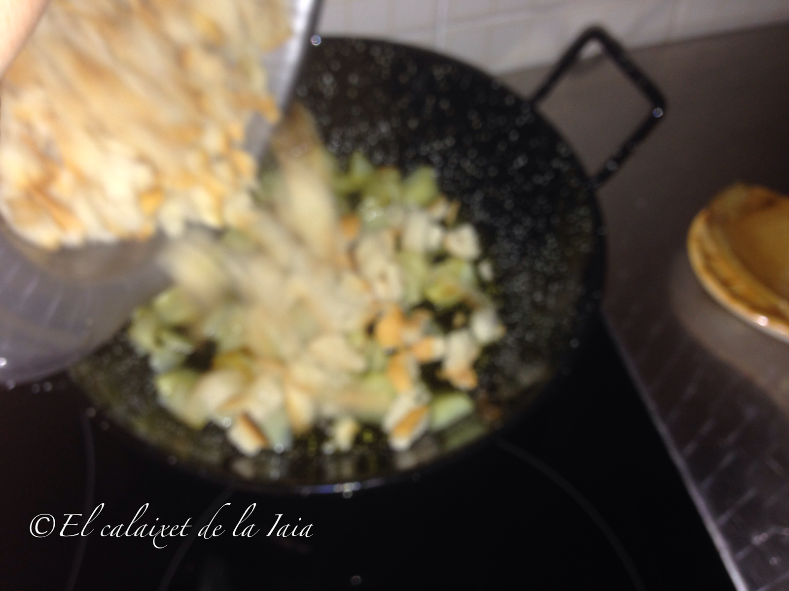 cuando las patatas ya se hayan ablandado antes de dorarse, añadimos el pan humedecido