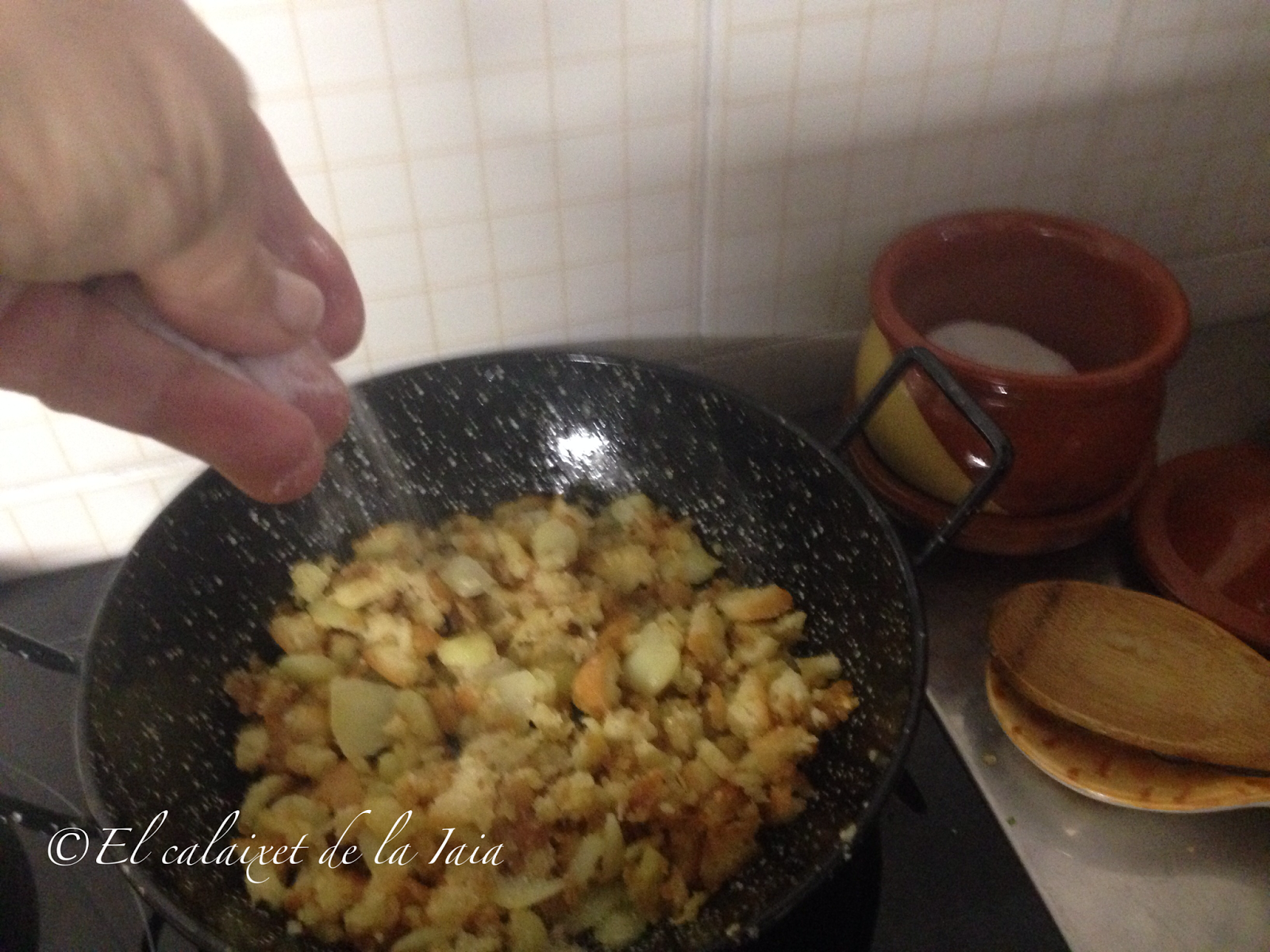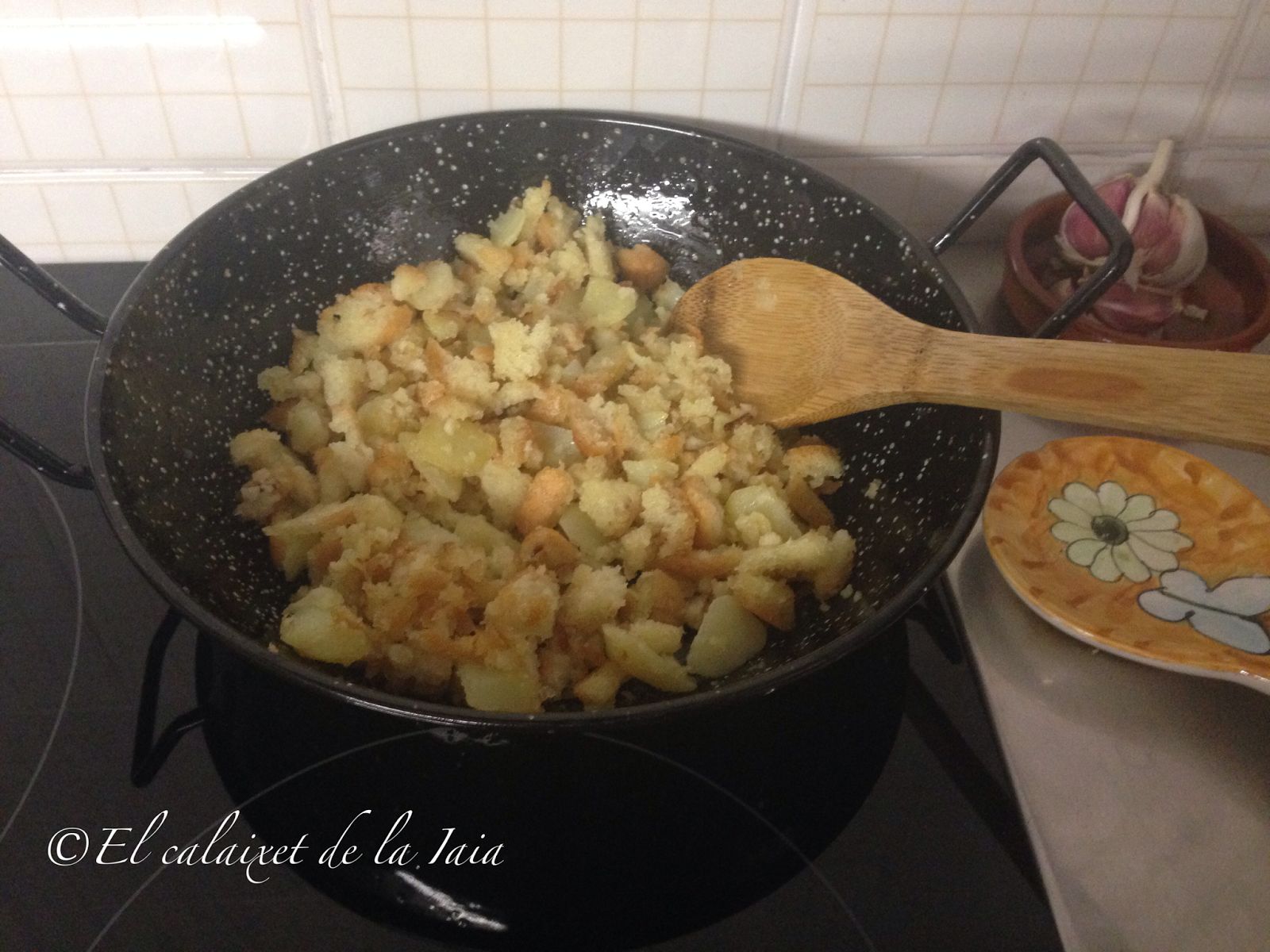 y ahora es cuestión de ir dando vueltas y vueltas con el fin de que no se quemen, hasta que quede el pan crujiente y dorado junto a las patatas