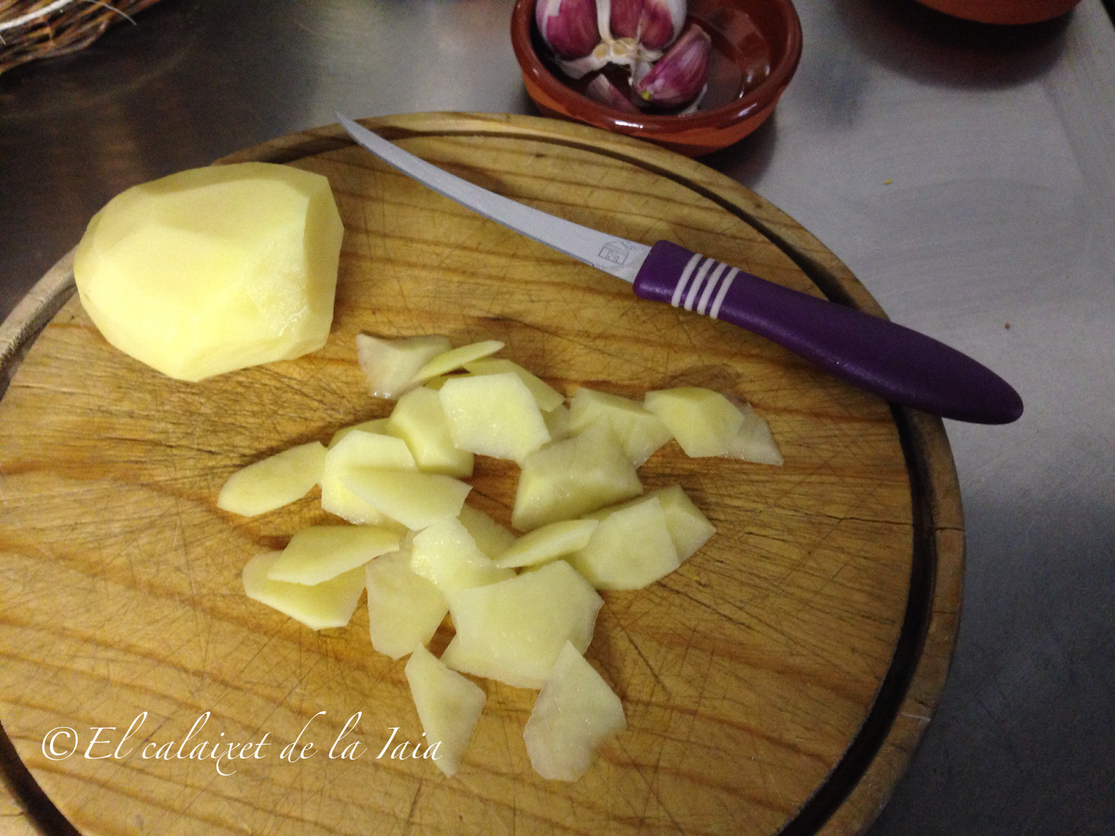 Comenzaremos pelando la patata, que en éste caso es de la tierra, de la sierra de Albarracín, de la huerta de mis primos Salvadora y Vicente, que son insuperables. La patata aragonesa, al igual que la gallega son patatas distintas, si no las habéis probado y tenéis ocasión, os recomiendo encarecidamente que lo hagáis, se pueden encontrar en cualquier mercado. En casa, tenemos el privilegio de éstas que además son ecológicas, mmmmm madre mía, nada que ver con otras patatas.