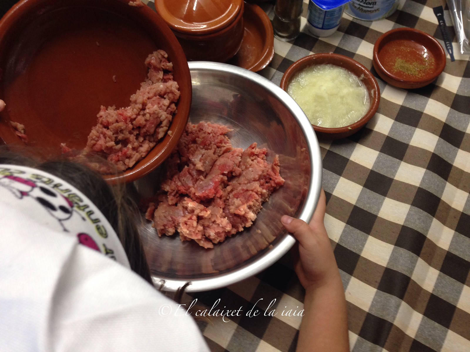 ponemos en un bol la carne de ternera y de magro que nos han picado delante de nosotros, se puede sustituir por carne de pavo y pollo,ternera o por cordero, como el original