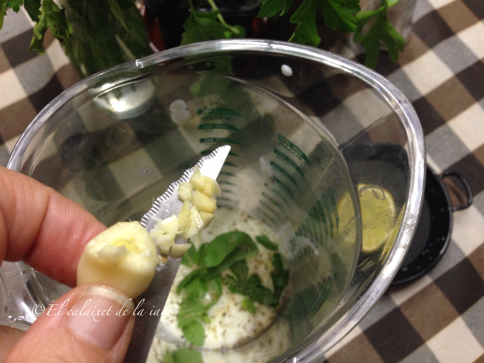 Quitamos el nervio central al ajo para que repita menos, lo troceamos y lo añadimos a las hierbas
