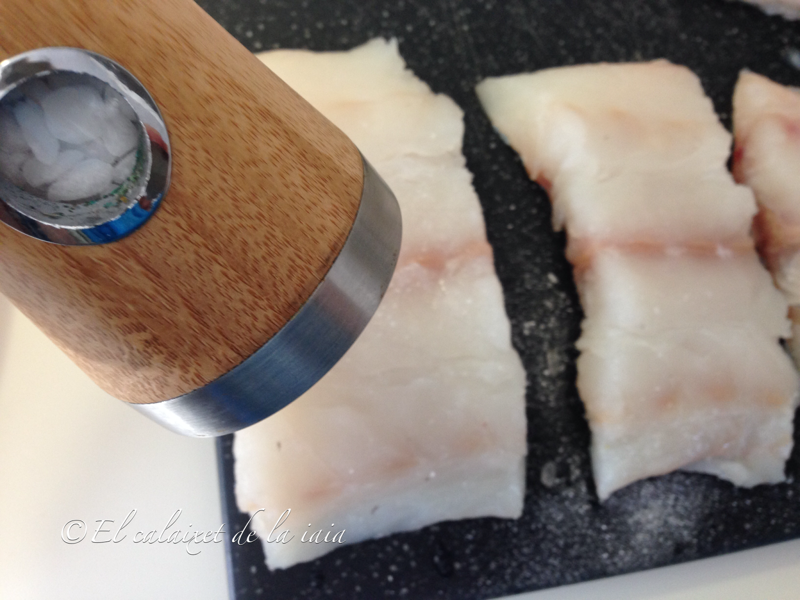 Pedimos en la pescadería que extraigan la espina central al bacalao, que junto a la media cabeza que nos toca, luego la aprovecharemos para con unas verduritas, preparar un fondo de pescado o fumet, que siempre va bién tener en el congelador.