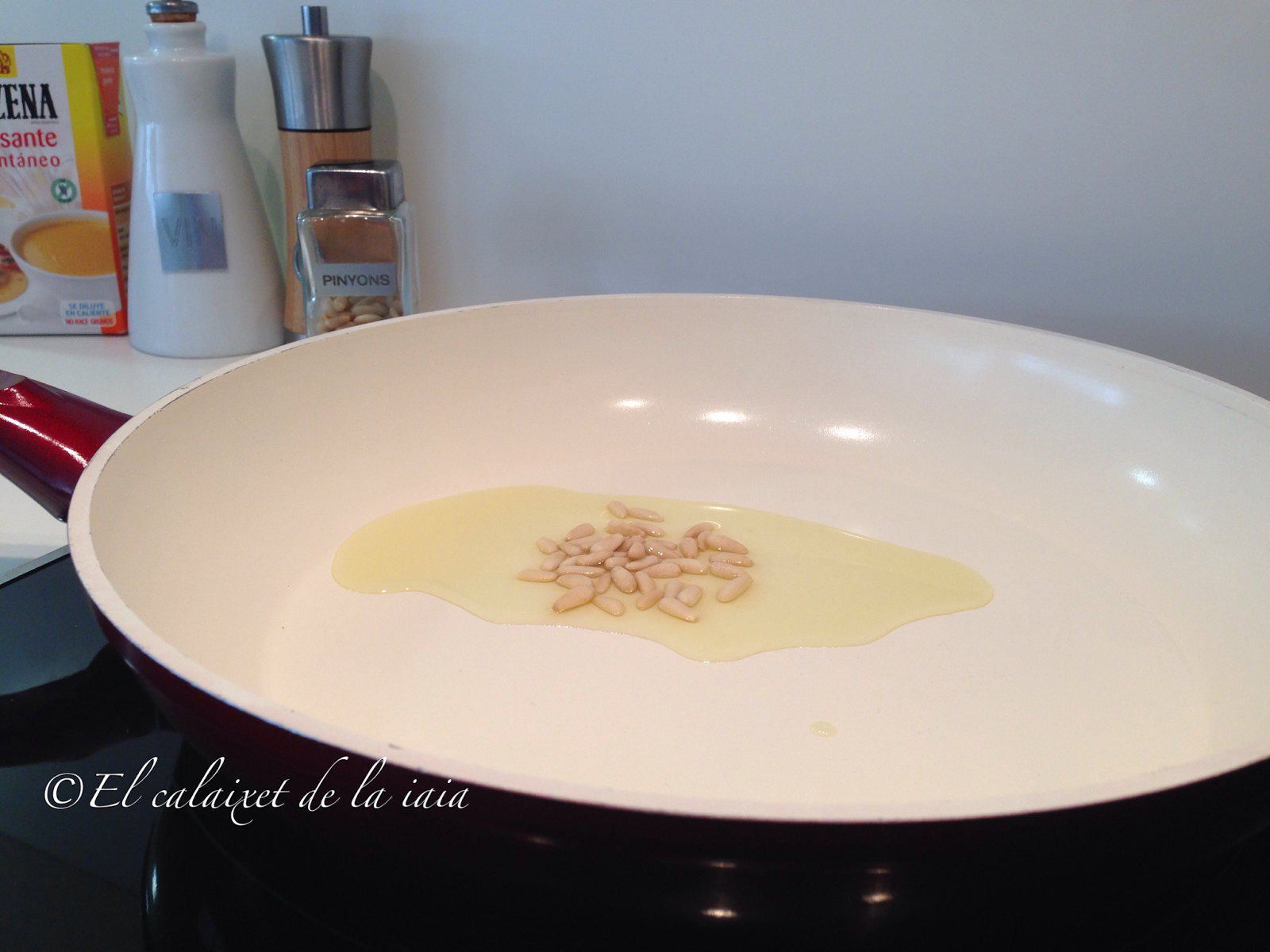 Ponemos un poco de aceite de oliva en una sartén al fuego, doramos los piñones y los reservamos