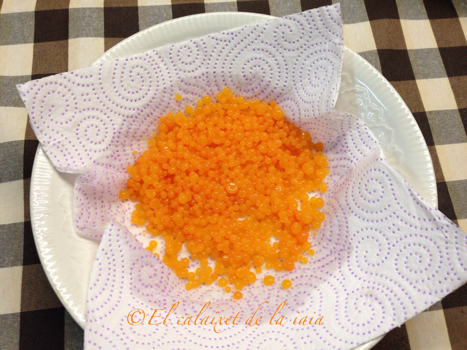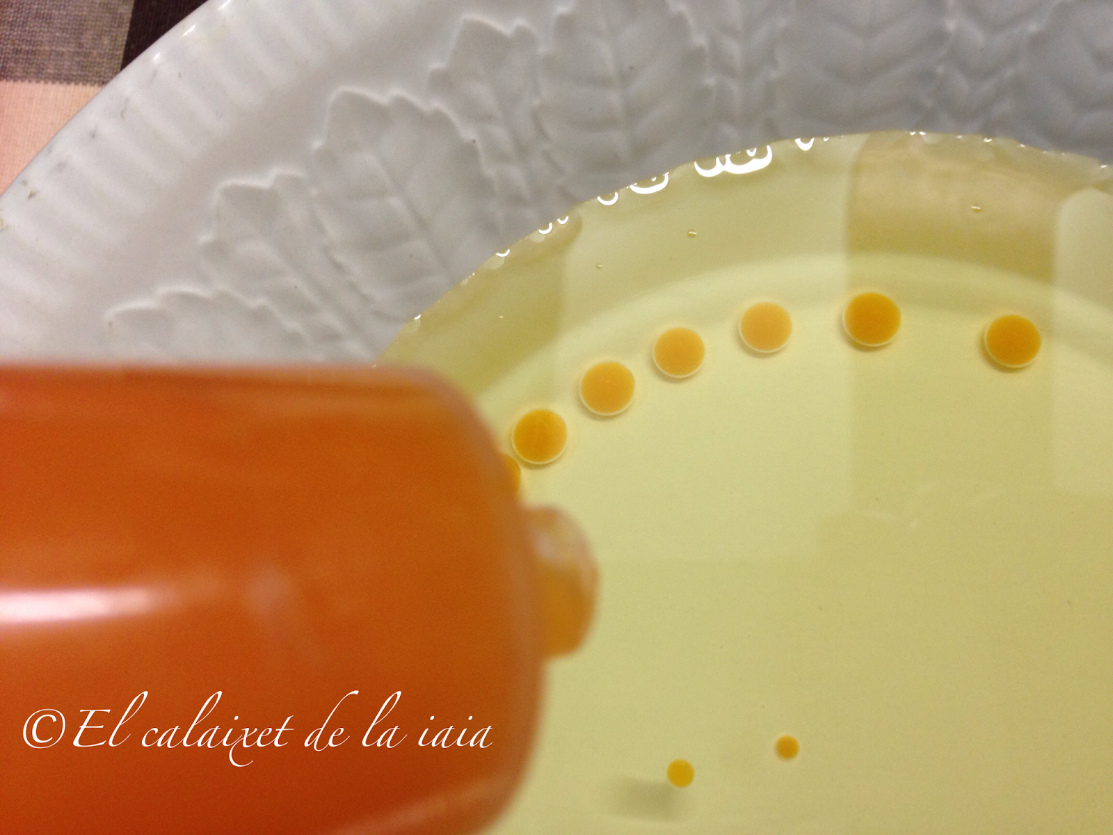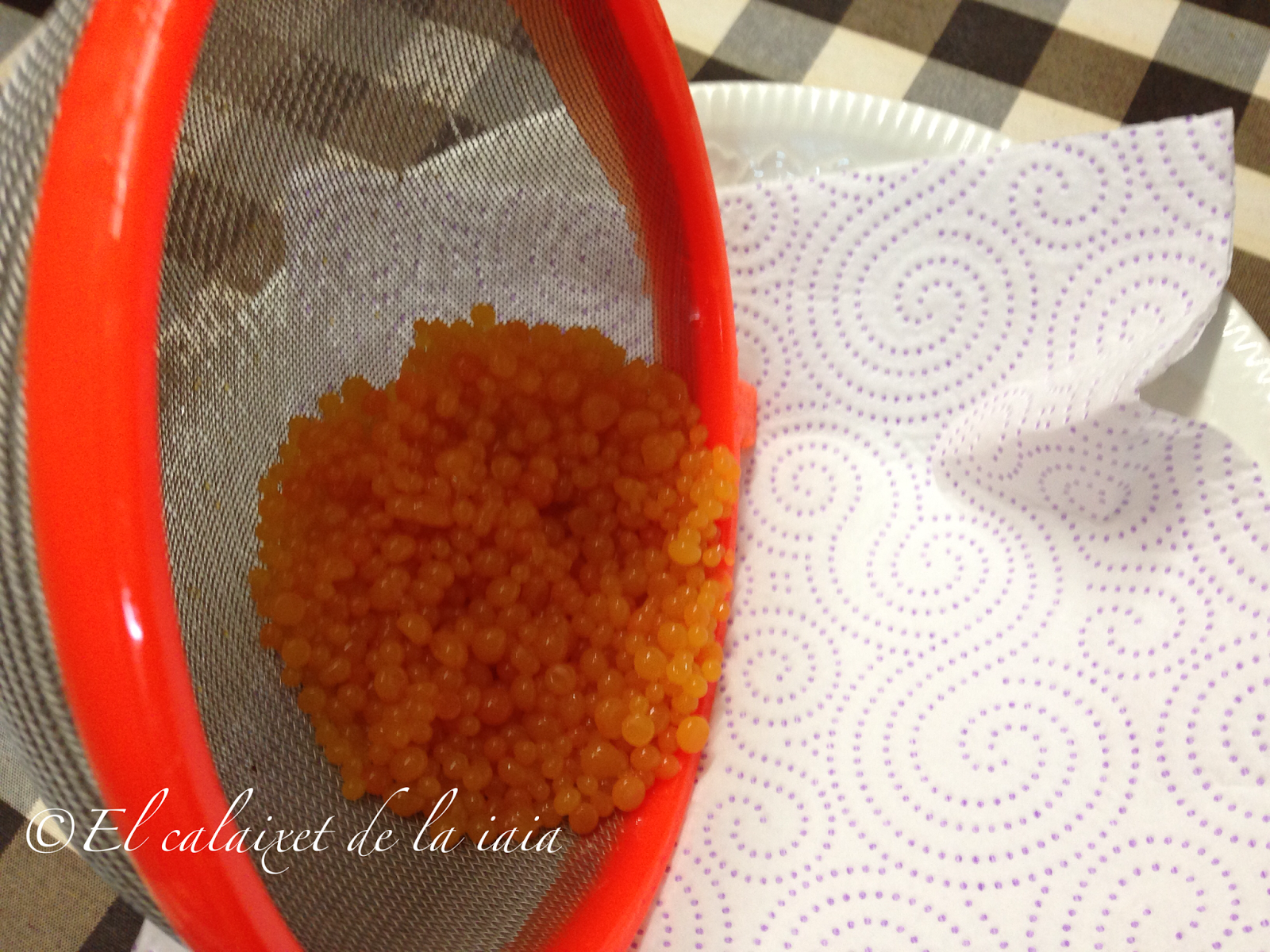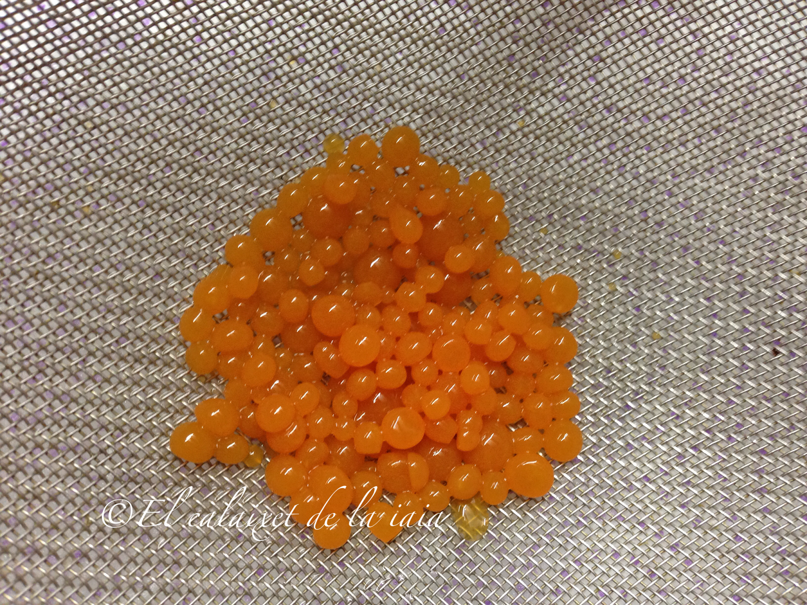 iremos soltando gota a gota en el aceite frío, y con el contraste de temperatura veremos como se hacen nuestras bolitas de tipo caviar color naranja. Iremos rellenado la jeringa y haciendo las bolitas sin prisa, pero sin pausa, porque una vez se enfría, se forma la gelatina y ya es difícil hacer las bolitas.
