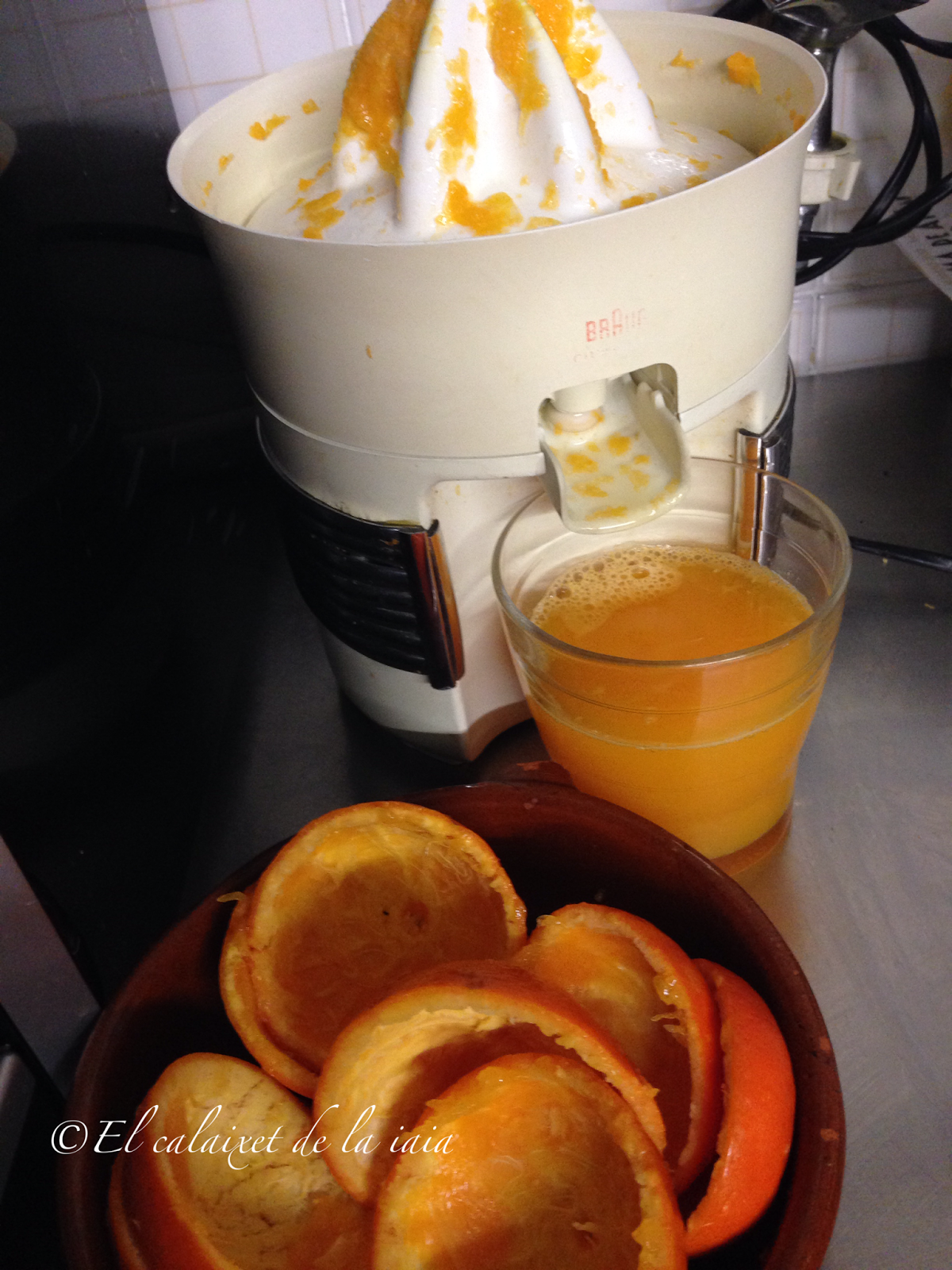 Preparamos el zumo de mandarinas, con la ayuda de mi minipinche favorita que quería ver como su iaia hacía «magia» con las mandarinas, jajajajaja