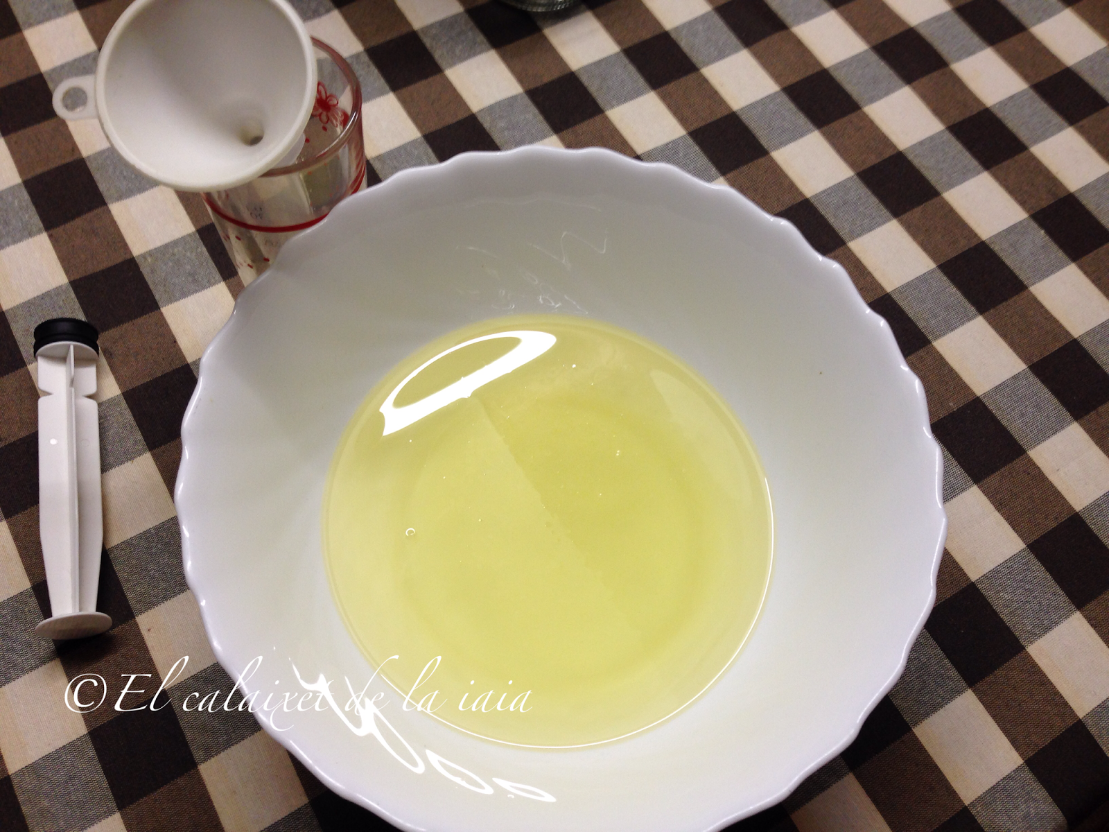 Para ésta preparación lo primero que hemos de hacer, es conseguir que el aceite de girasol esté lo más frío posible y para ello lo pondremos en un recipiente ancho y hondo en el congelador, por lo menos, media hora
