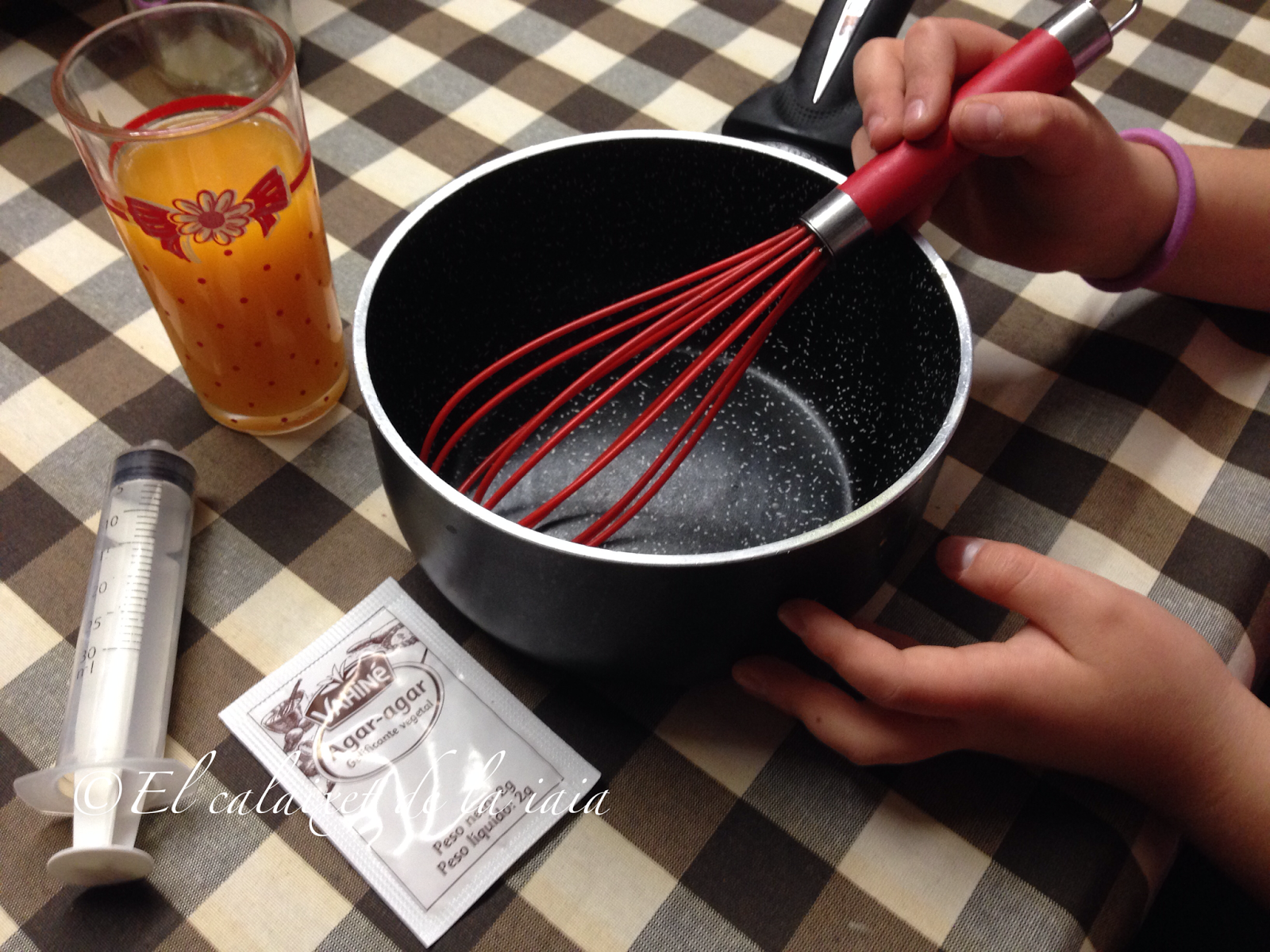 y volcaremos el zumo en la jeringa, colándolo para que no obstruya la salida de las gotas que formarán nuestro «caviar»