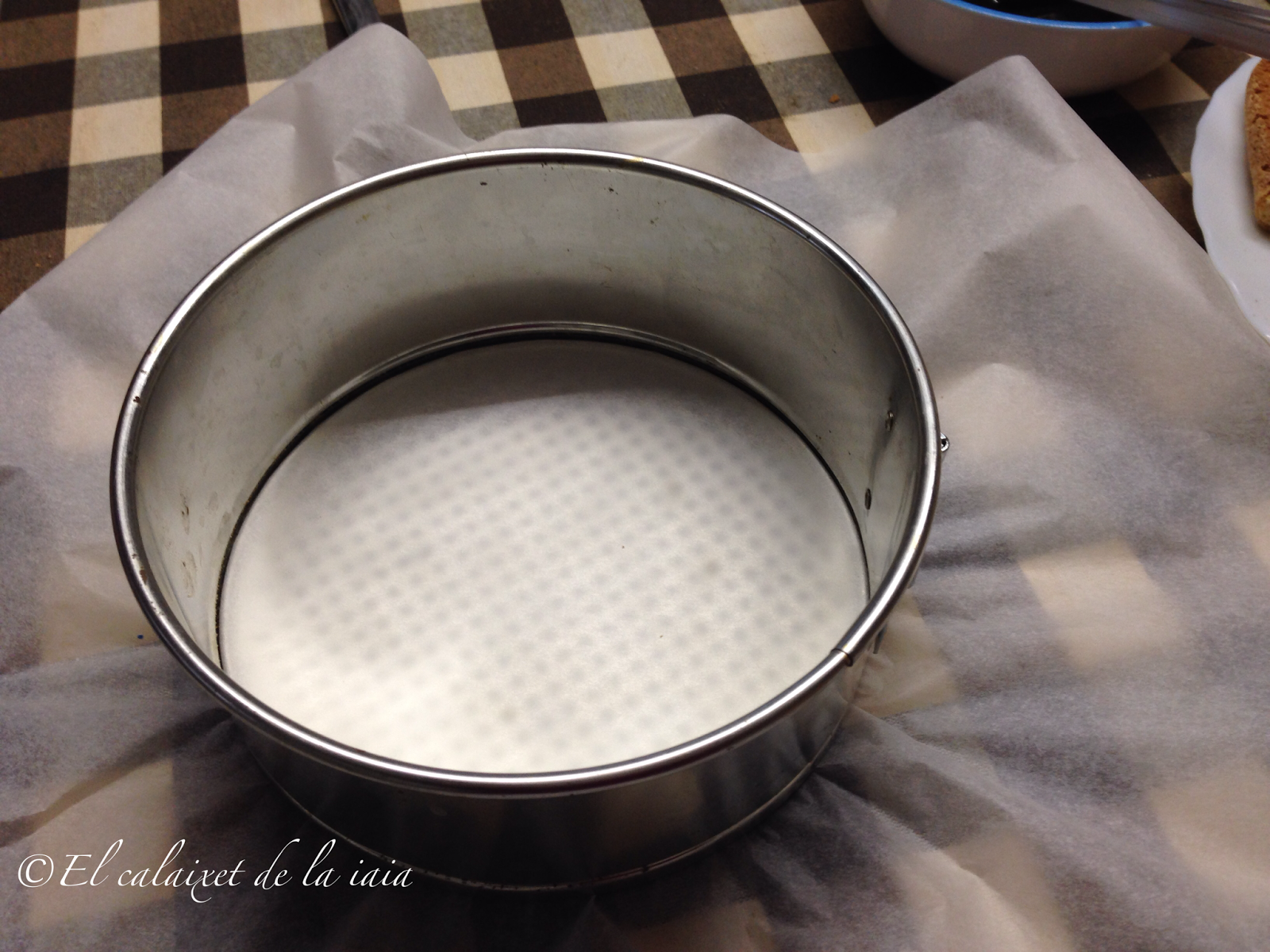 colocaremos en el plato del molde desmoldable, nuestro truco para que quede estanco y facilitar luego el traslado a la fuente de servir, una hoja de papel sulfurizado y cerraremos el aro