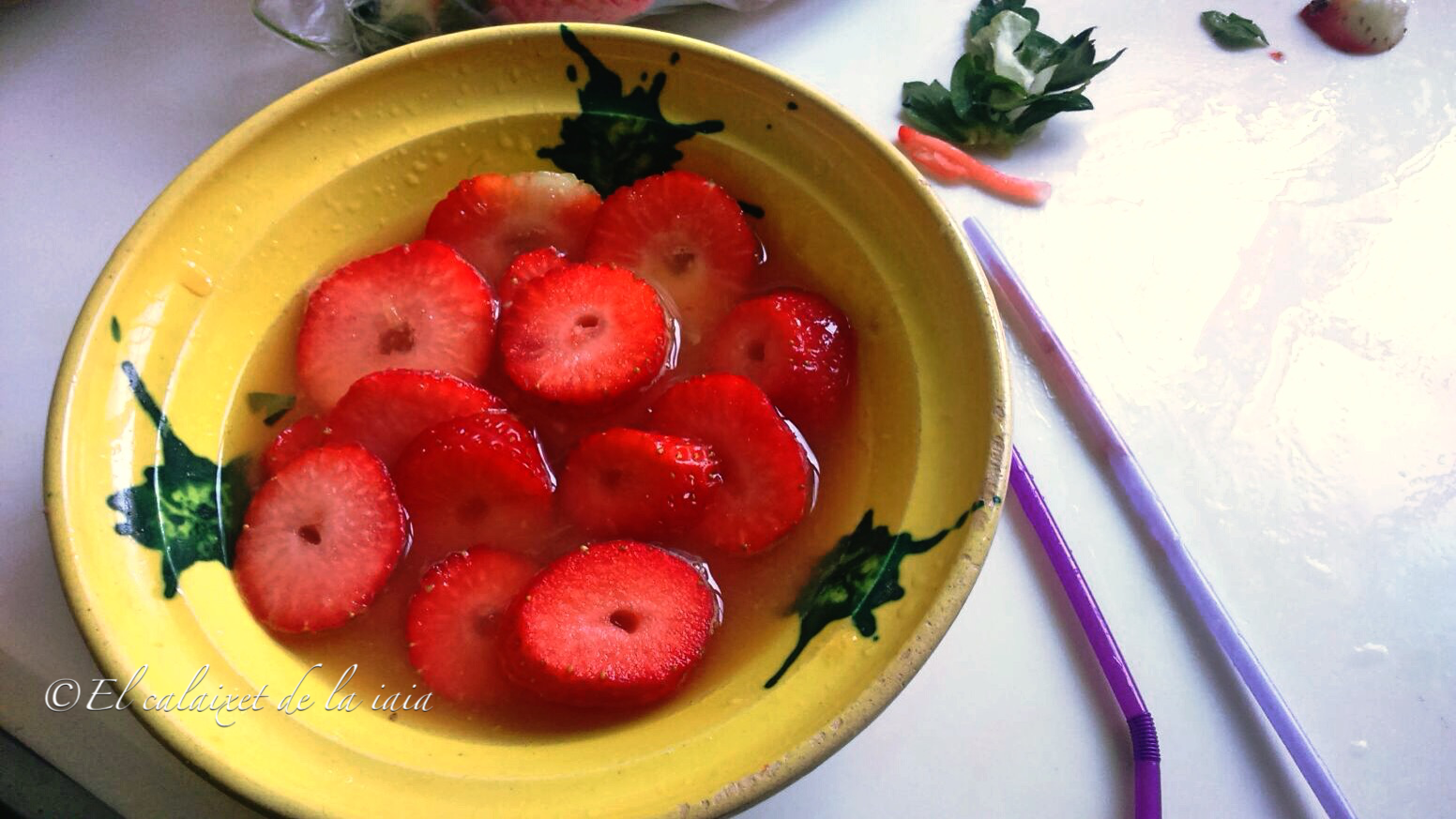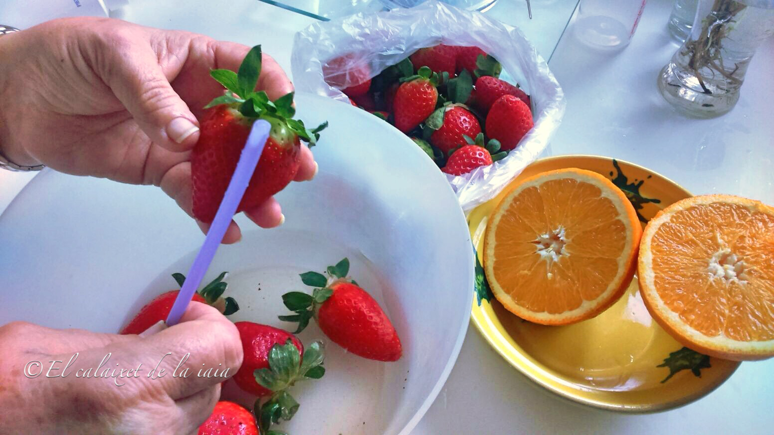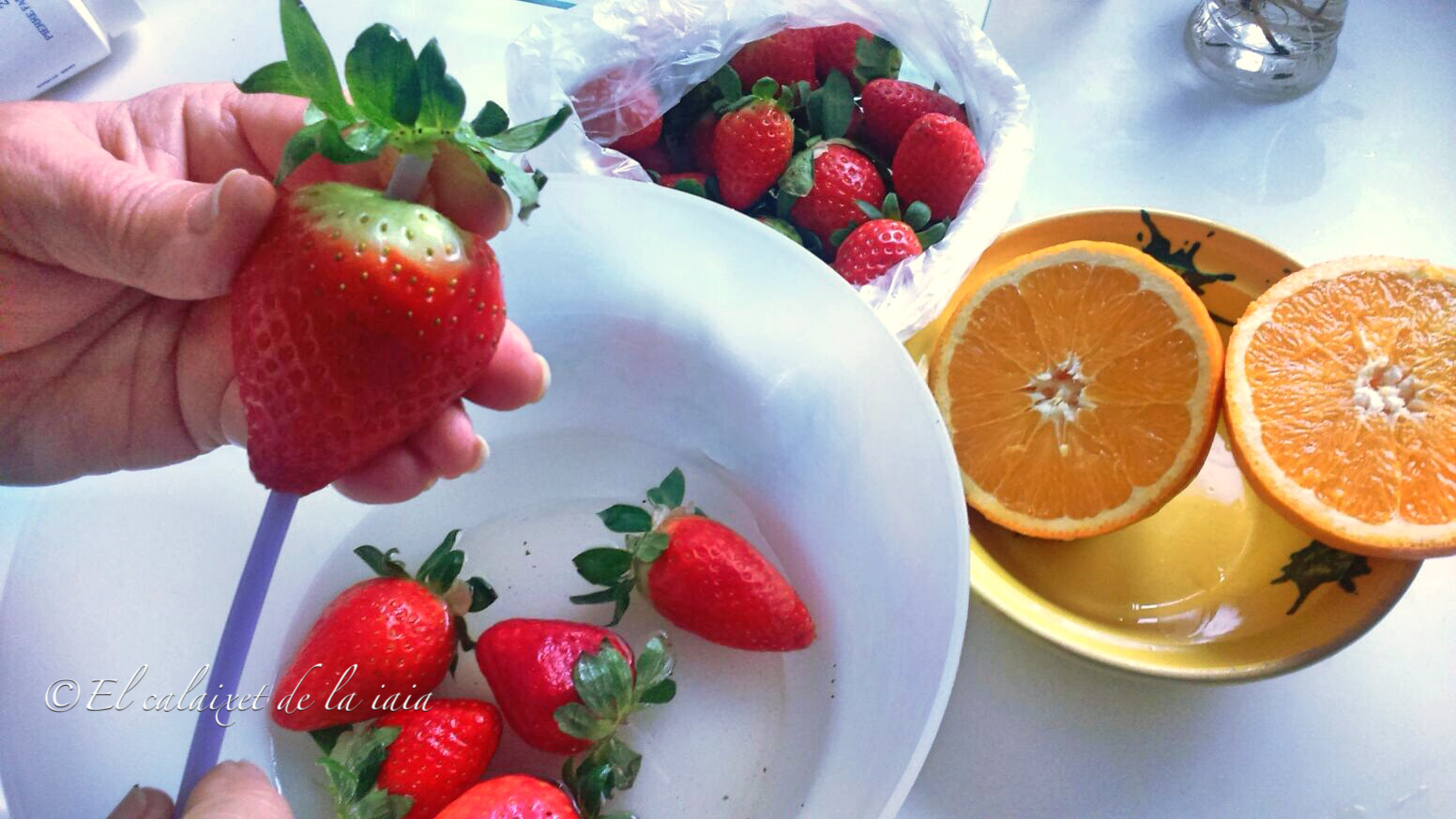 Esta vez vamos a necesitar únicamente, una pajita, así que una vez tengamos los fresones o fresas enjuagados