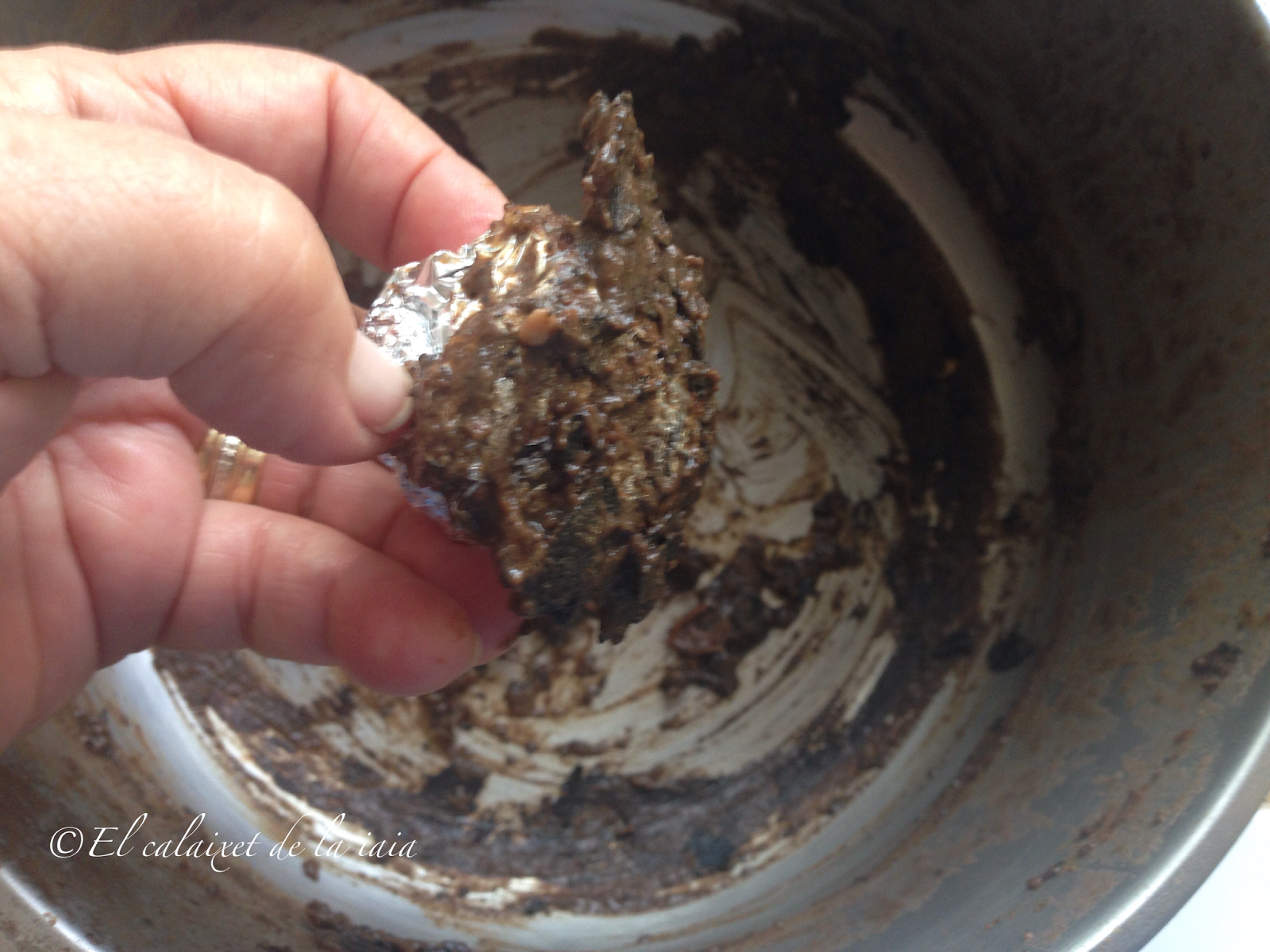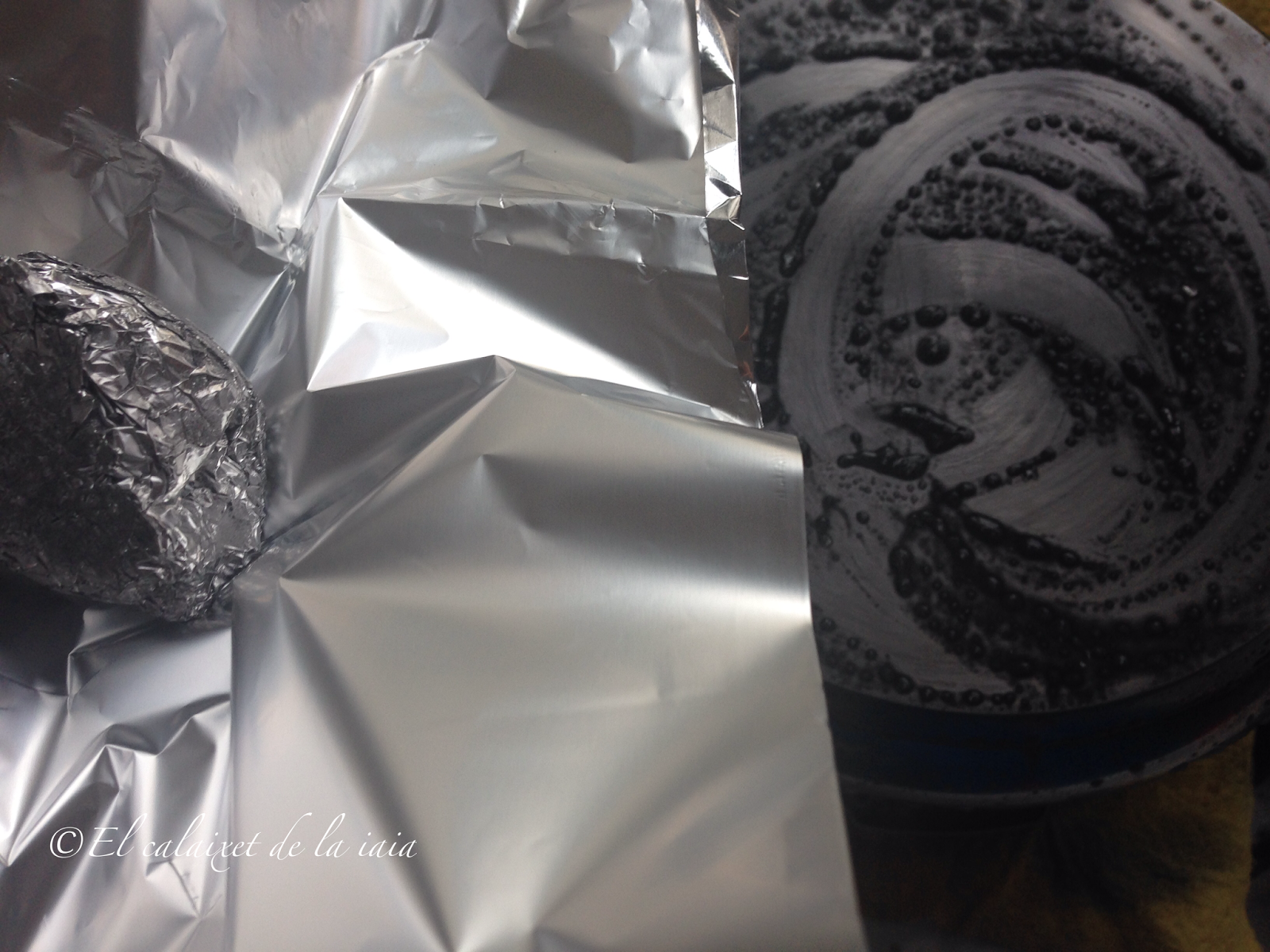 veremos que con poco esfuerzo va saliendo lo quemado, os recomiendo usar guantes porque quedan muy sucias las manos y uñas. Iremos enjuagando nuestra pelota de papel alu,inio para ir eliminando la suciedad