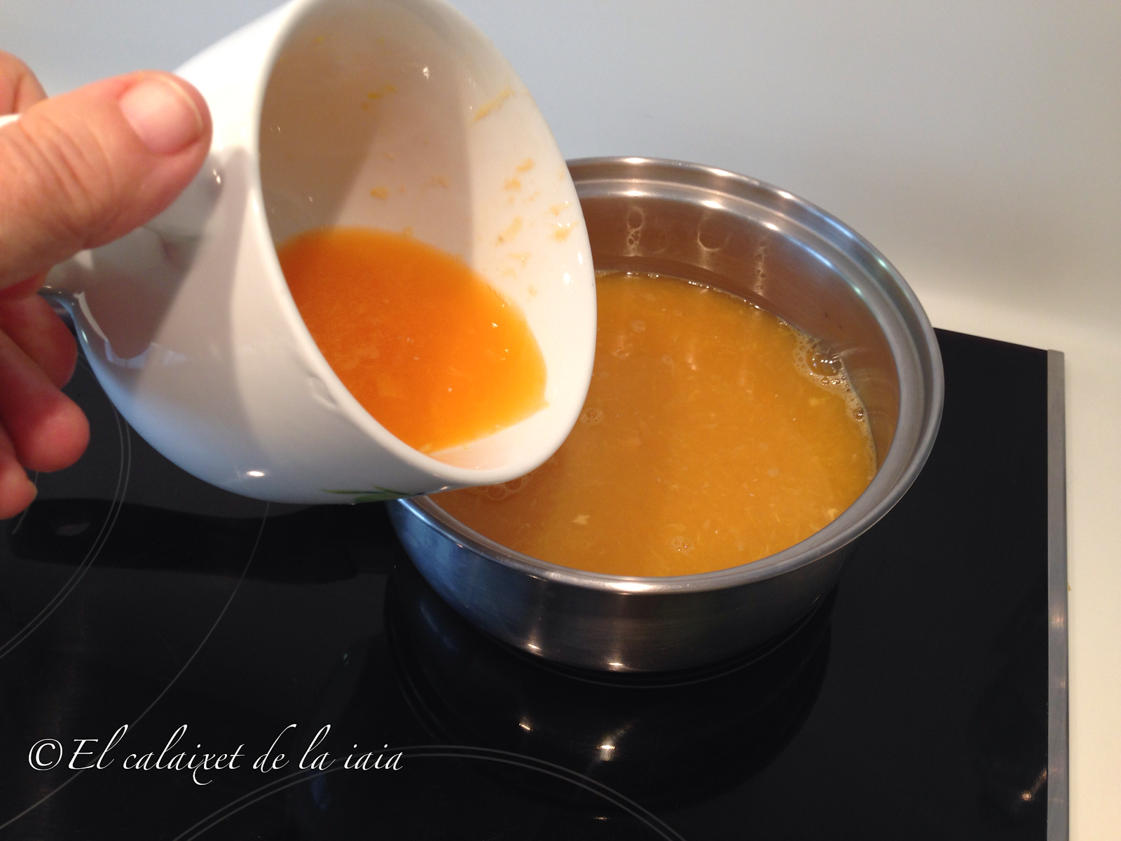 Volcaremos en un cazo los zumos sin preocuparnos de la pulpa ya que luego lo colaremos