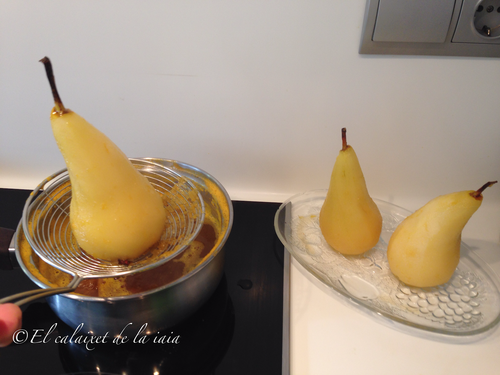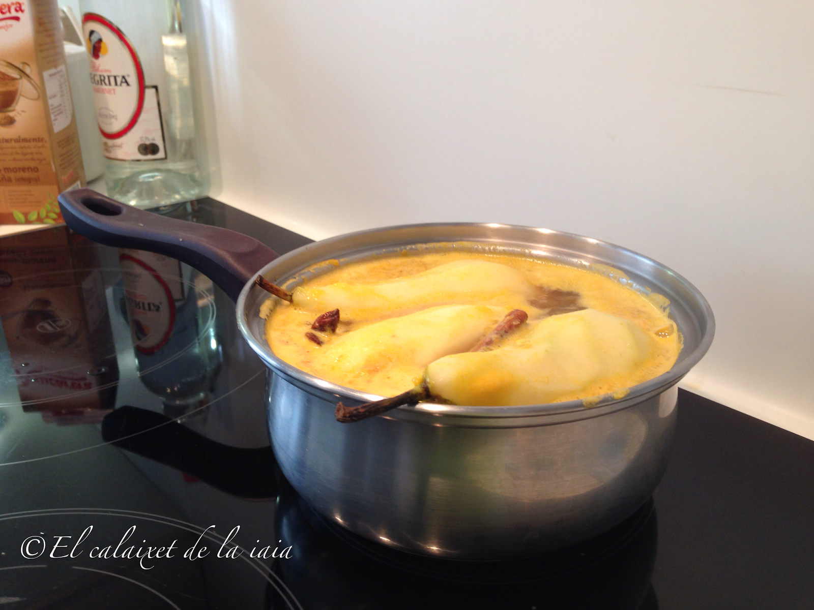 Ponemos a hervir con los zumos y dejaremos a fuego medio para que no se nos rompan las peras, unos 20 minutos hasta que al pinchar con un palillo entre sin dificultad, pero teniendo en cuenta que no han de quedar demasiados blandas, la textura ha de ser «al dente»