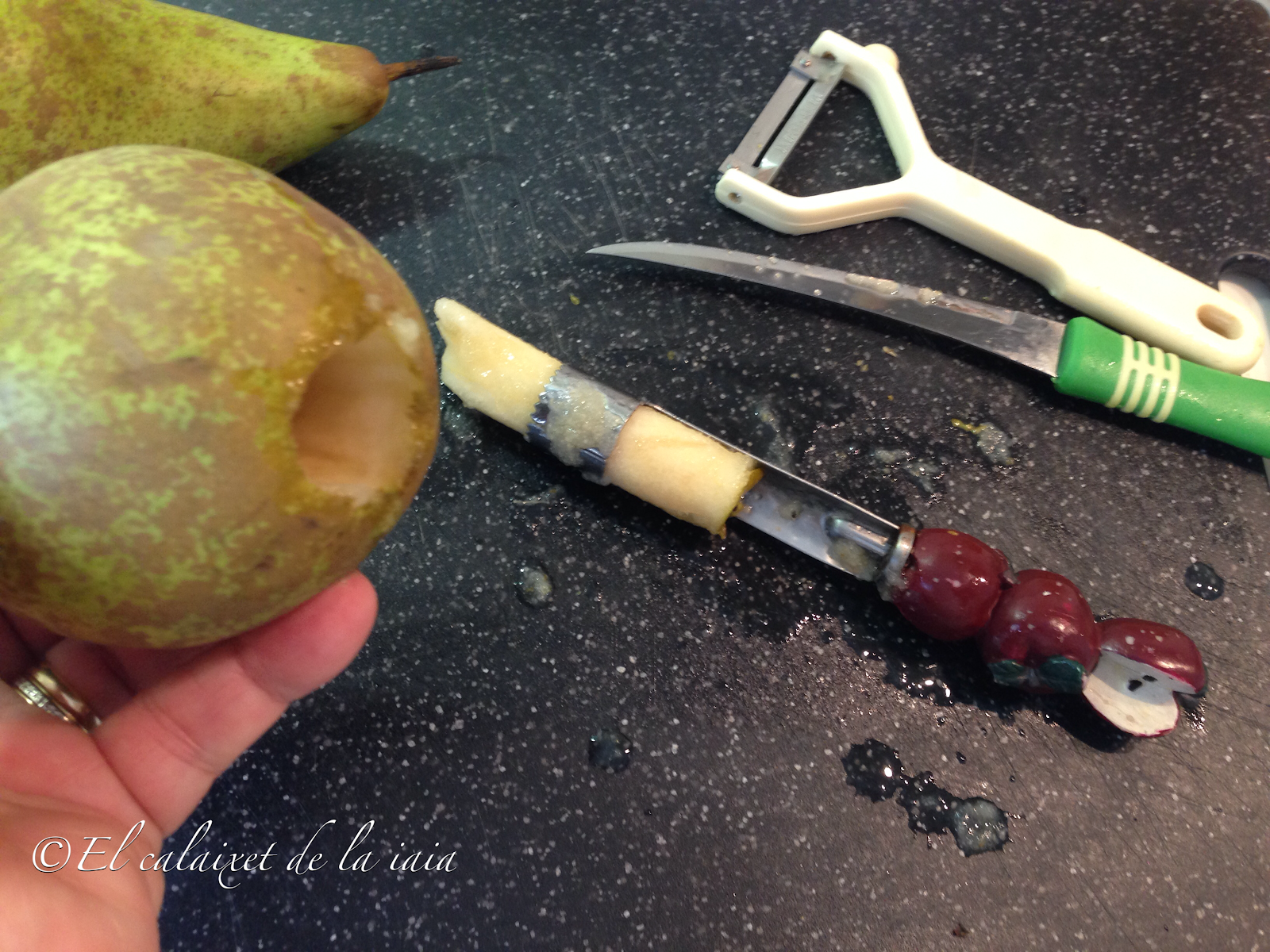 Mientras tanto, descorazonamos las peras. Éste paso no es imprescindible, pero a mi me gusta hacerlo siempre, porque luego se come todo «a mòs redó»