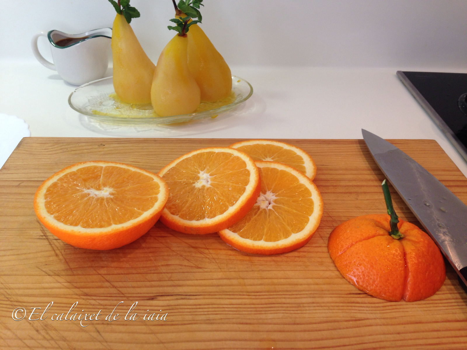 lavaremos una naranja y cortaremos tres rodajas de mas o menos medio cm. que usaremos como bases de las peras