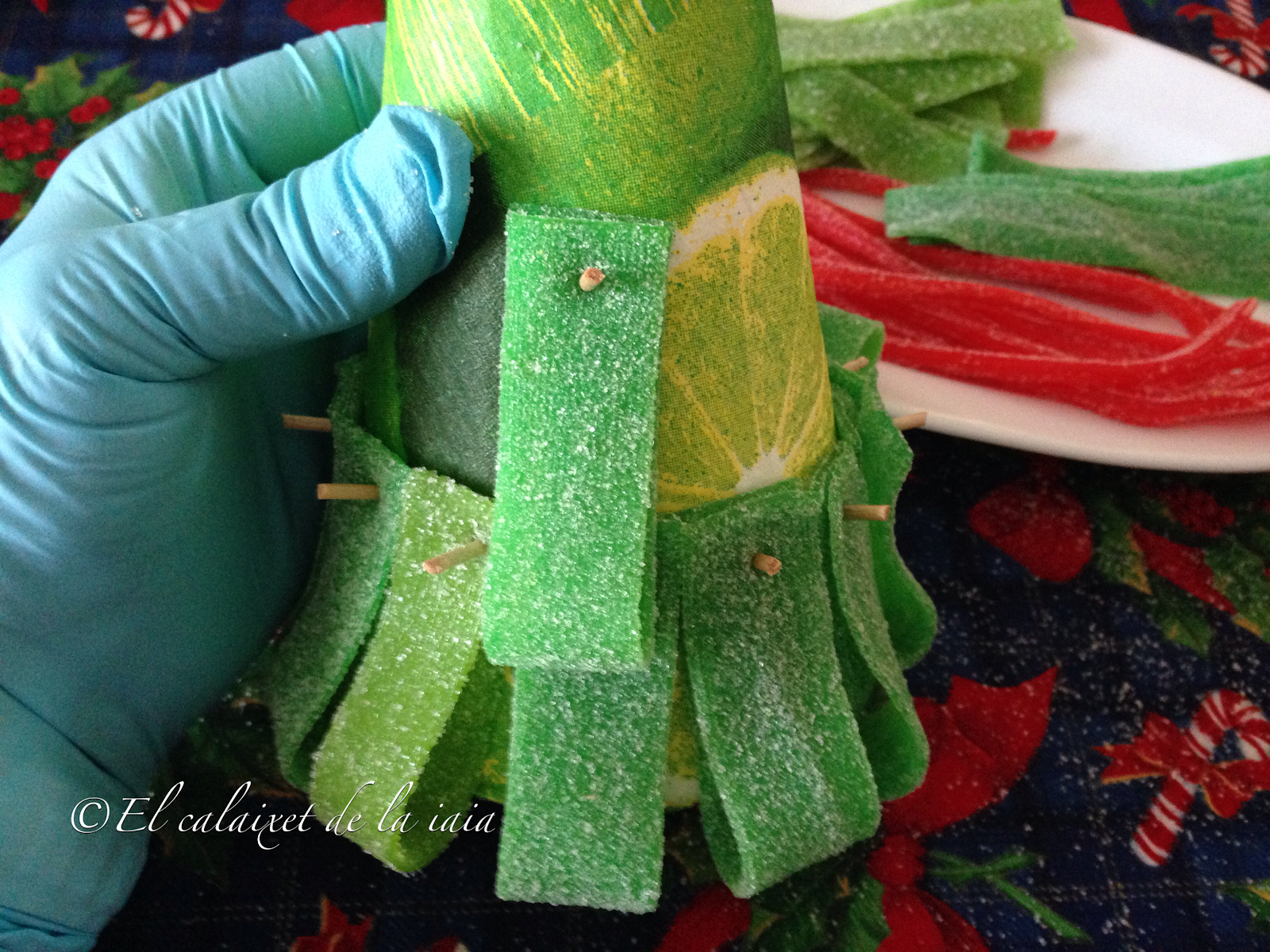 iremos poniendo gominolas de colores que simularán las bolas del árbol y cubriremos con ellas las puntas de palillo que queden visibles
