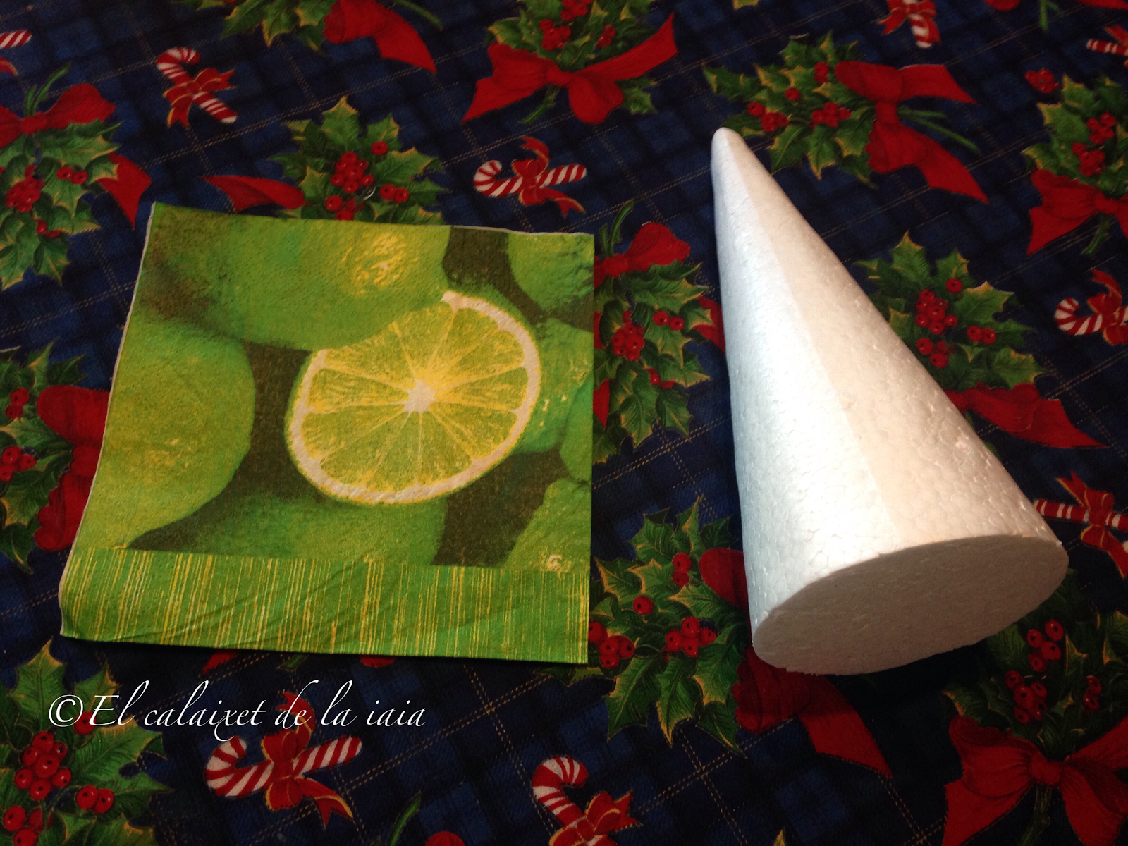 Lo primero que necesitaremos hacer es forrar el cono de poliespan, ya que se trata de un material de trabajos manuales y no apto para uso alimentario. Por tanto, como no sabemos que materiales lo componen, lo forraremos con papel de cocina, servilleta, papel aluminio, papel vegetal, o papel film por ejemplo.