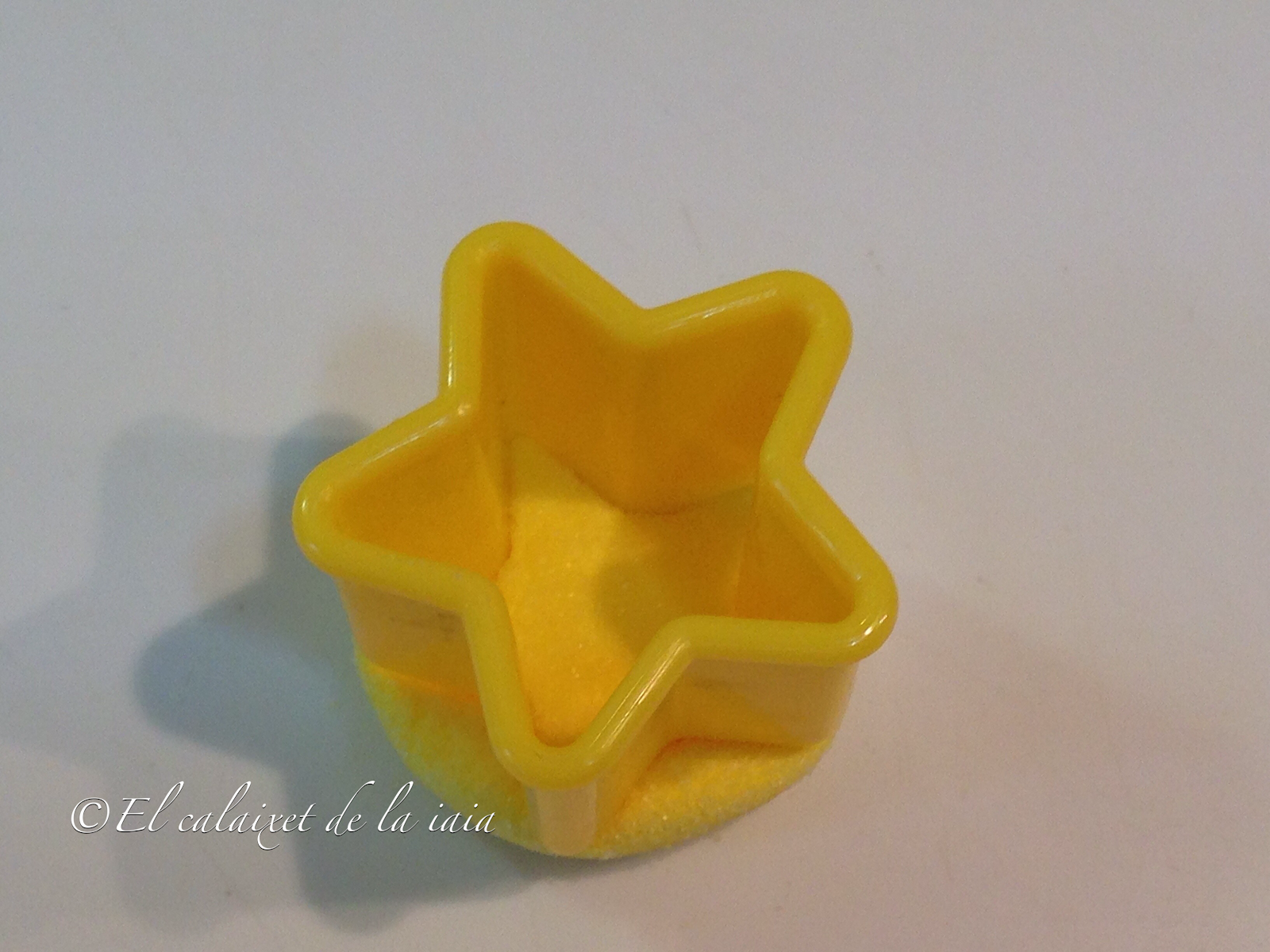 Con un cortapastas de estrella daremos forma a la chuche de color amarillo, la pincharemos con un palillo