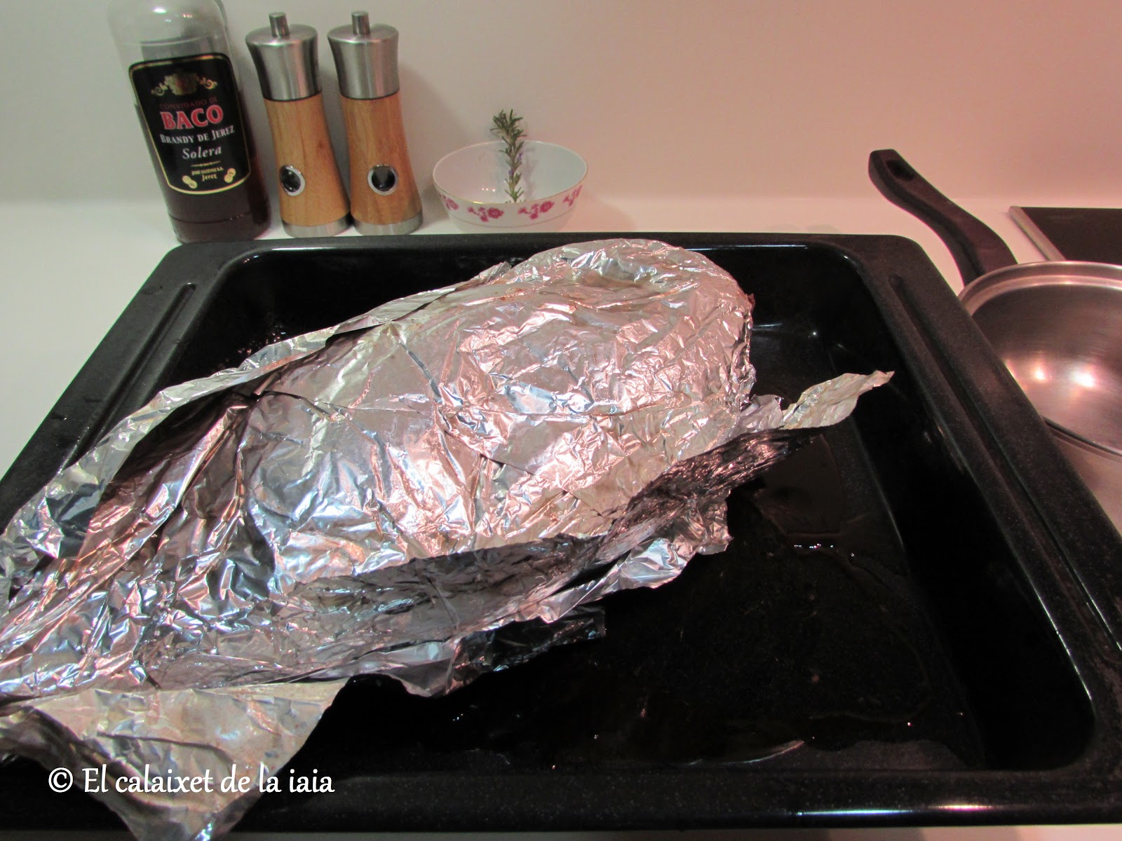 Cuando lo vayáis a comer, sacádlo del horno y preparar un cazo, desliar con muchísimo cuidado la pieza para aprovechar hasta la última gota del jugo que estará dentro del papel plata y volcarla en el cazo.