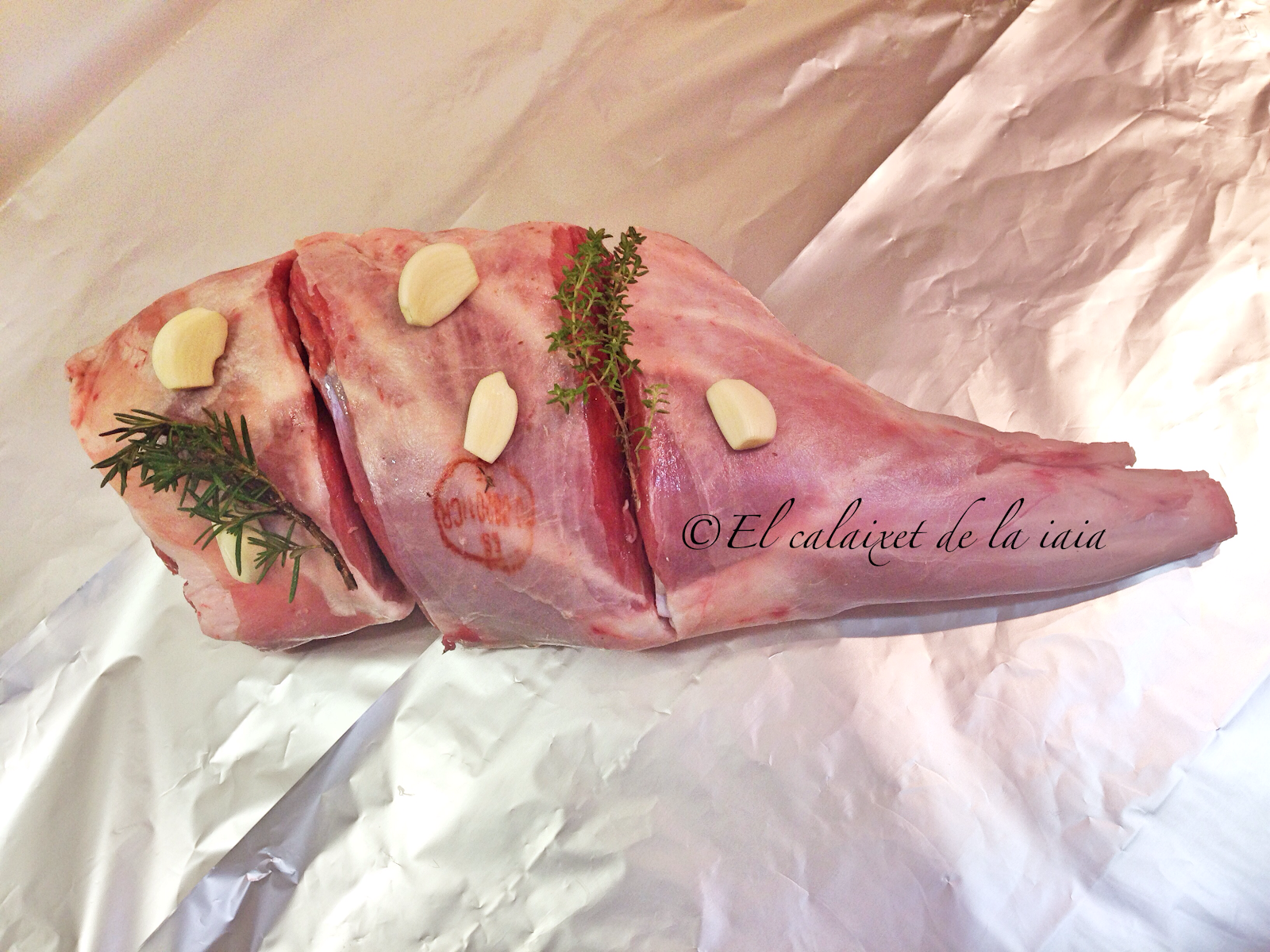 Hemos de poner el cordero SIN SAL, ni aceite ni nada de nada que no esté en la foto. IMPORTANTÍSIMO liar muy muy bien la pieza de carne con papel de plata muy bien pegado y hermético, que quede el mínimo aire entre la carne y el papel. Los jugos de la carne han de quedar en el interior para que quede la carne tierna y gelatinosa.