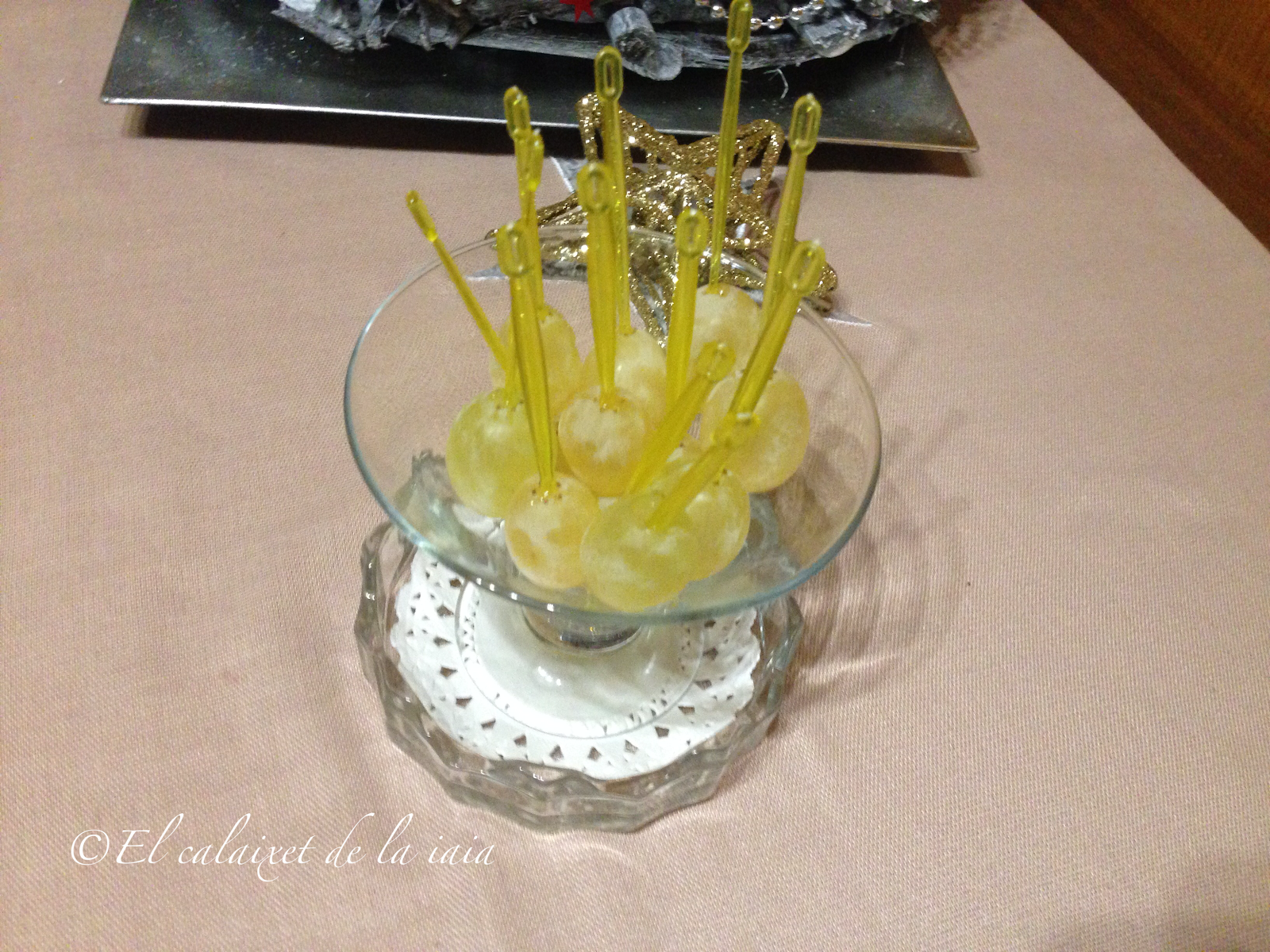 Las uvas pinchadas en palillos de plástico de colores y colocadas en copa Pompadour (que son las ochenteras del cava, ya no se llevan y hay que darles uso jeje), con el grano boca abajo
