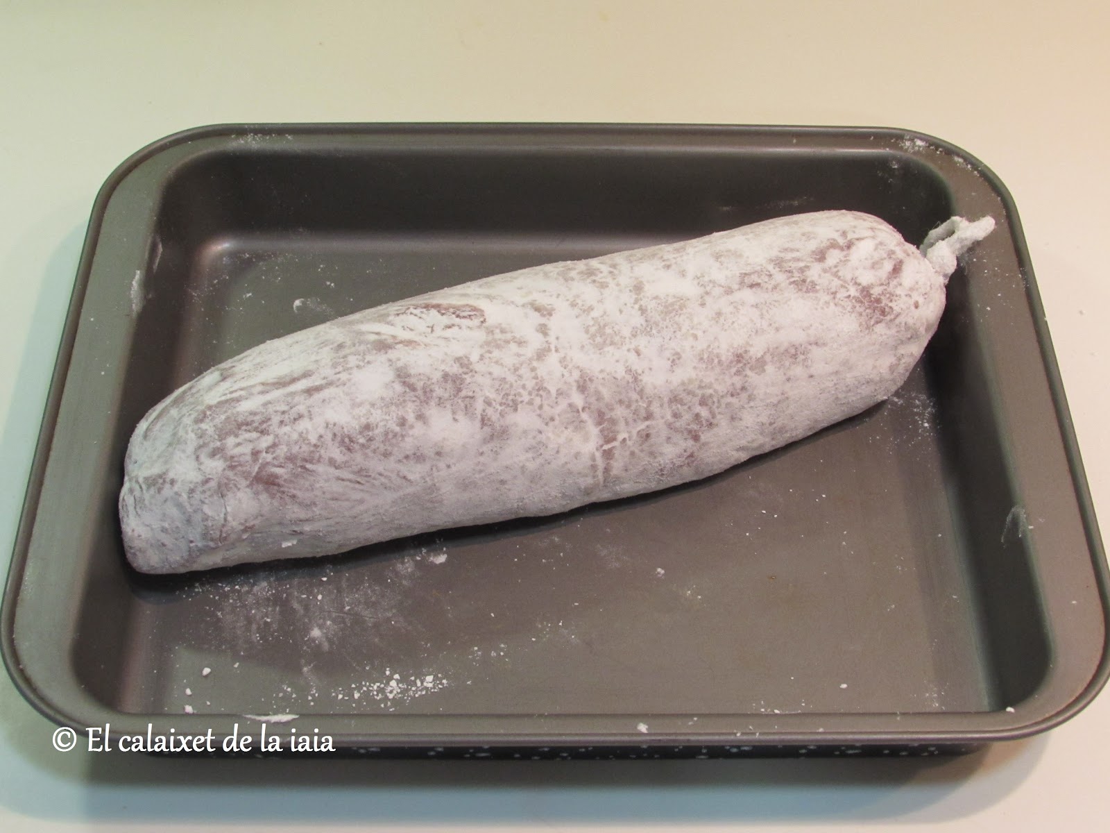 y volvemos a envolverlo con el film apretando con las manos para que el azúcar se pegue y haga el efecto de la piel del salchichón.
