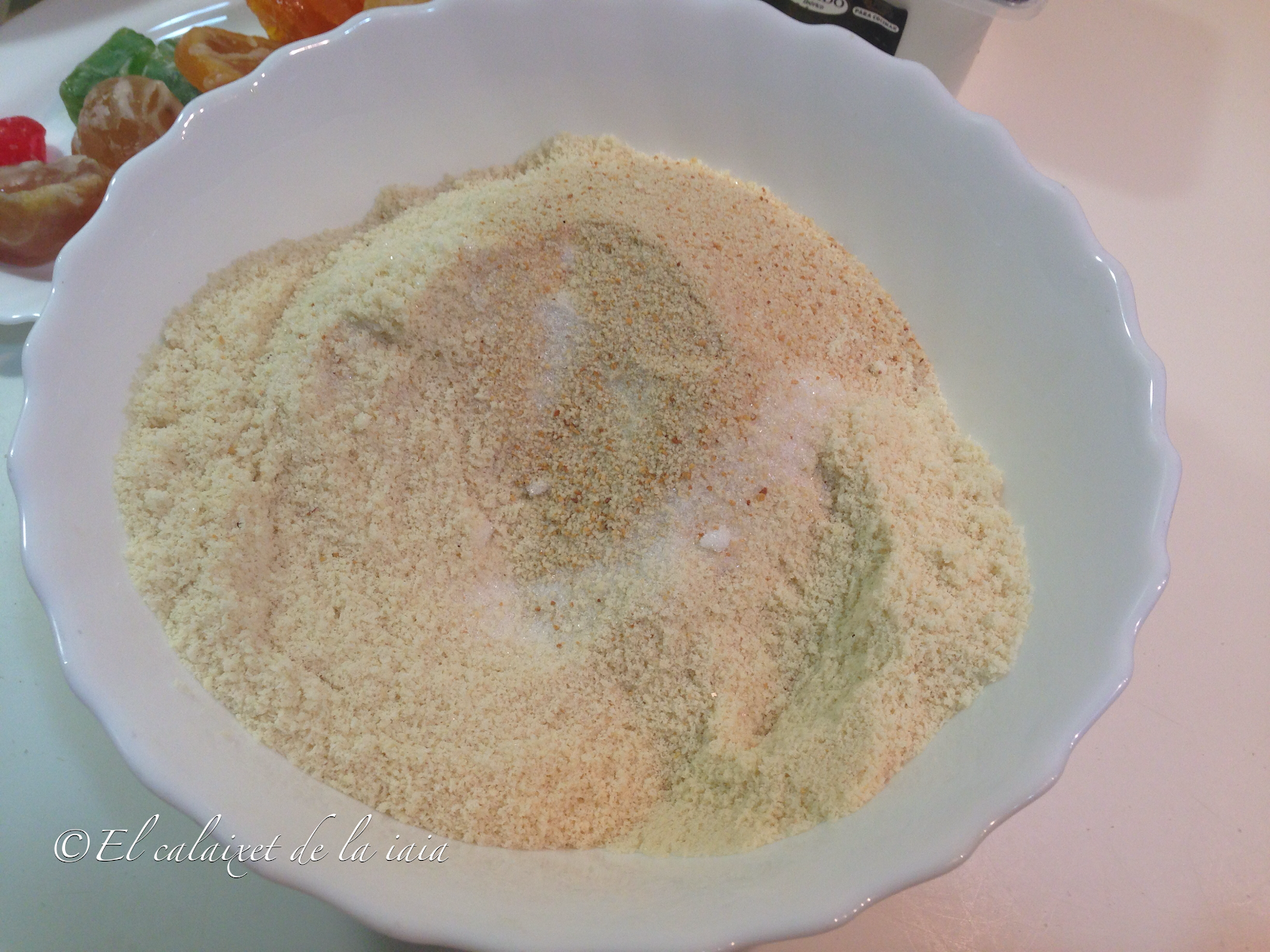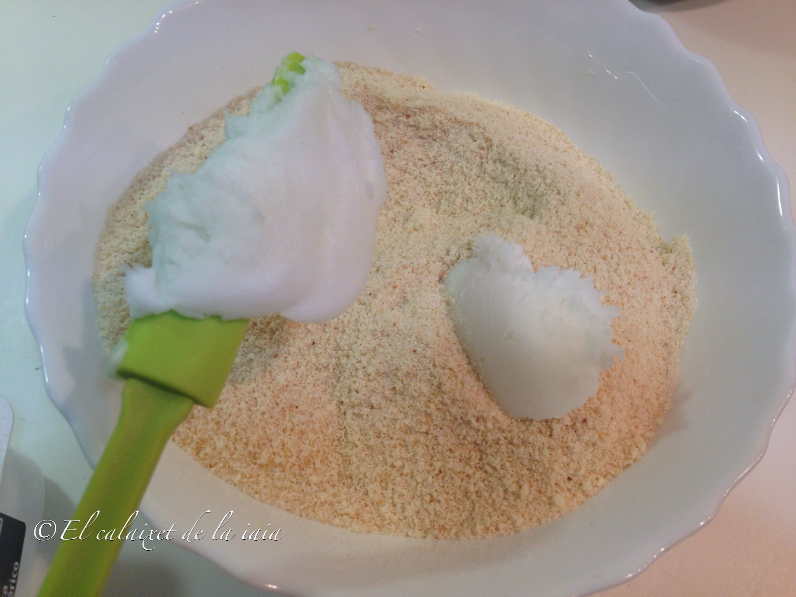 En un bol mezclamos primero los ingredientes secos, los 200g de azúcar, 200 de almendra molida, y los 150 de pan rallado
