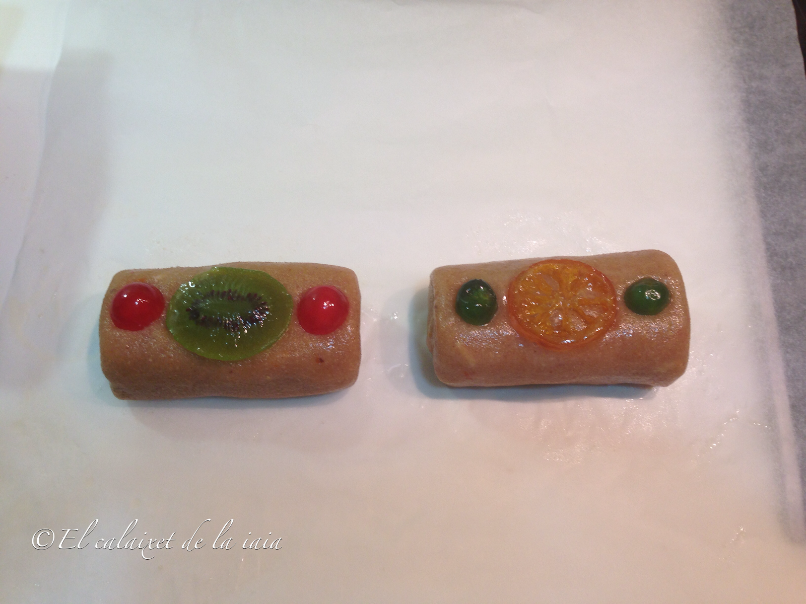 pondremos frutas confitadas a nuestro gusto, podemos dar la forma que queramos e iremos colocando sobre papel sulfurizado o de horno. Encendemos el horno a 180º,calor arriba y abajo