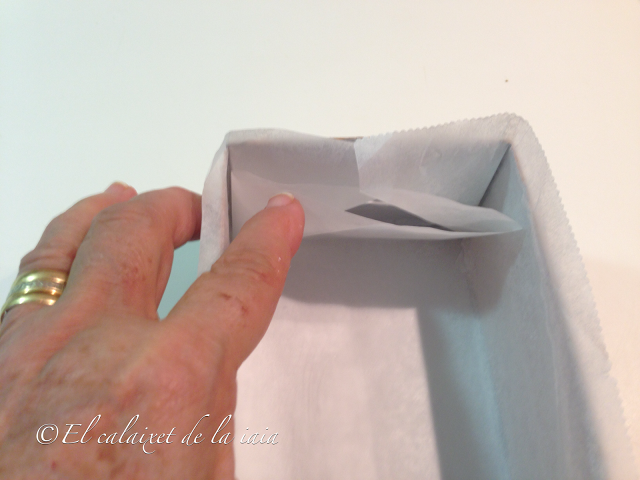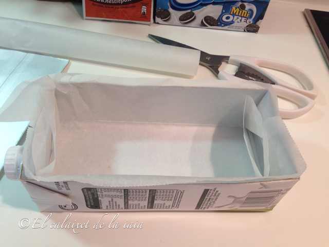 forraremos el brik con papel sulfurizado o de horno. Igual pensáis que para que forrar el molde si la parte interna del brik ya lleva una capa que permitirá el desmoldado….pues muuuy fácil, lo forraremos para evitar que las bacterias o restos de la leche puedan pasar a nuestro turrón.
