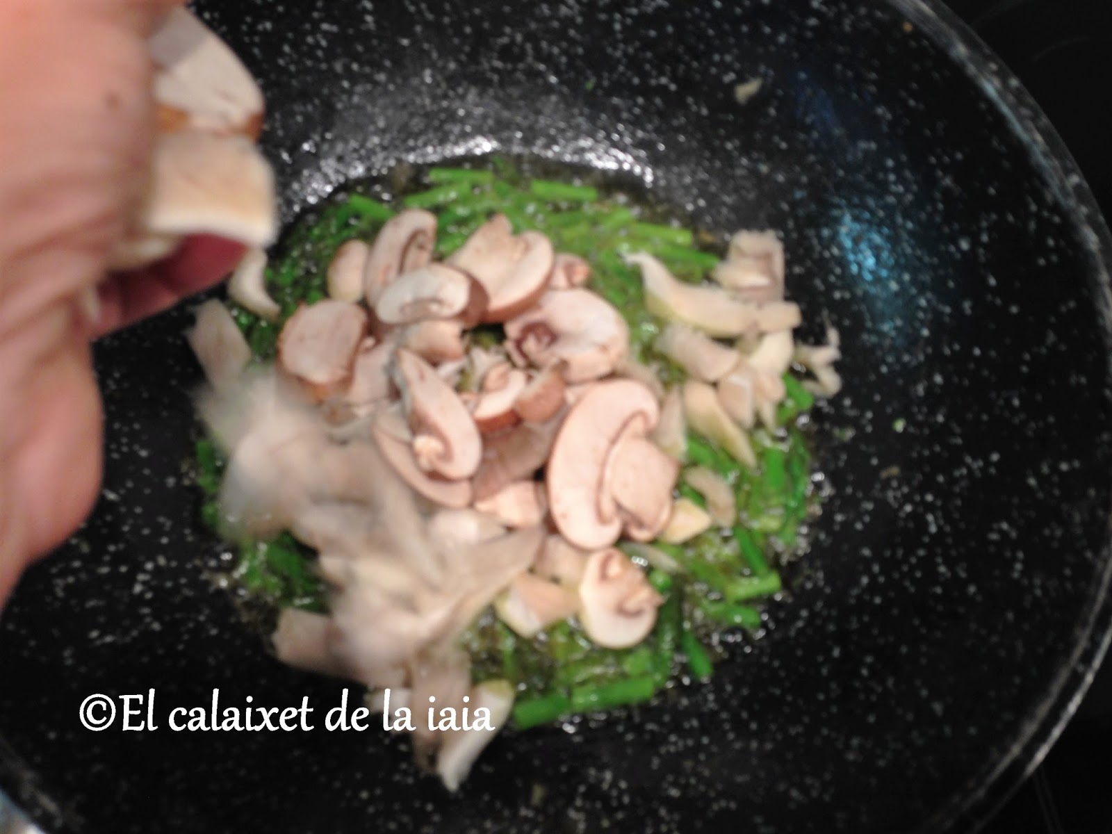 Troceamos los espárragos, y los ponemos a freír en aceite de oliva caliente