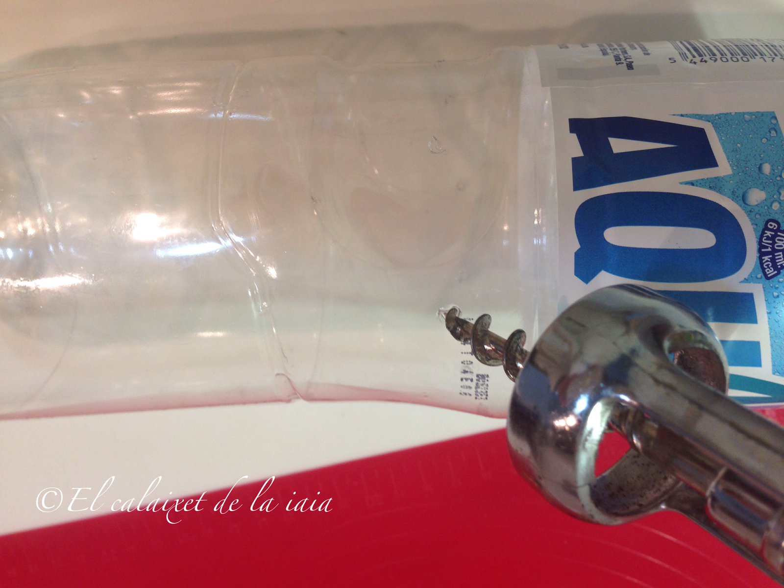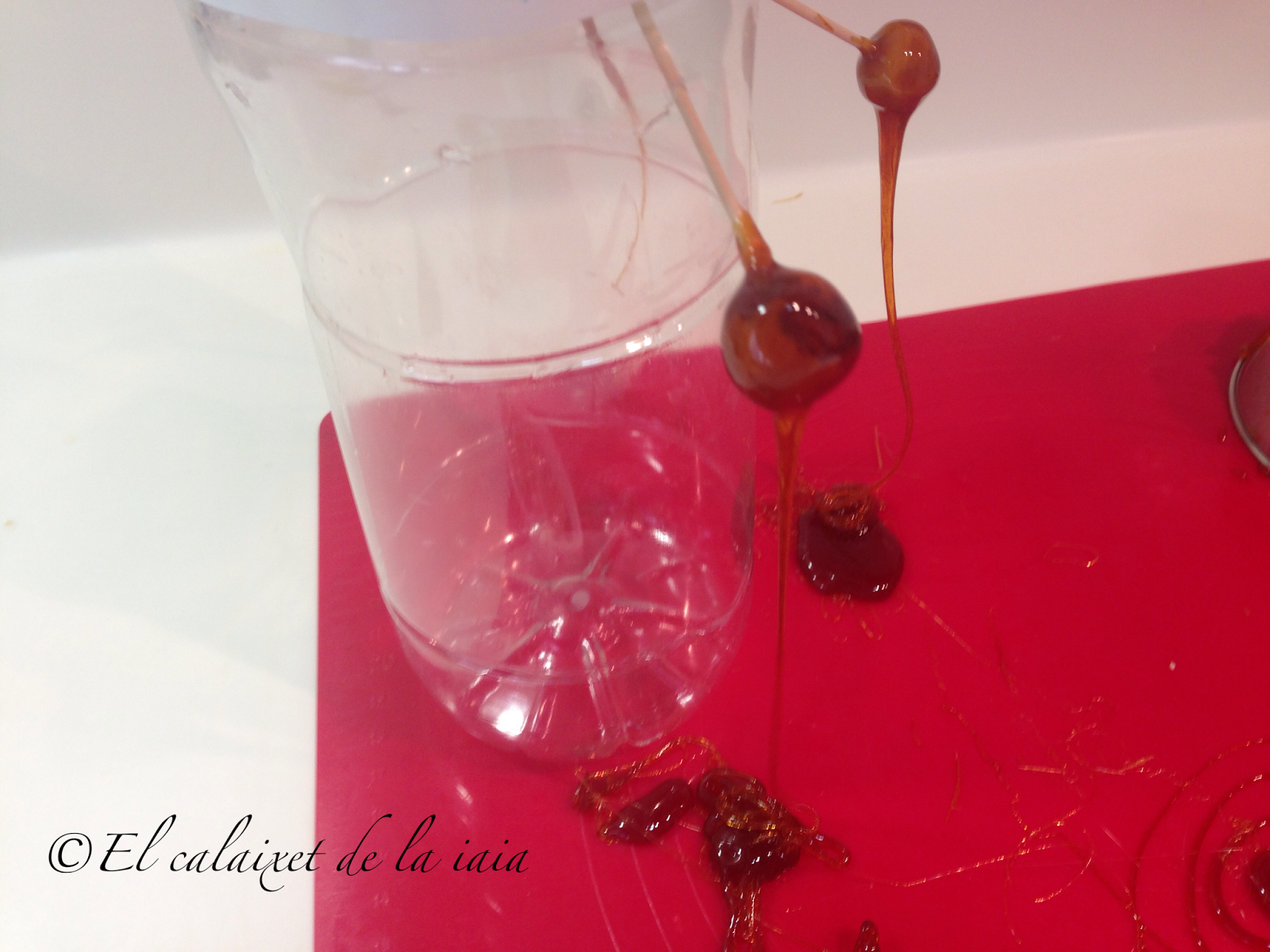 Lo perfecto para pinchar los palillos mientras chorrea el caramelo es un brik de leche por ejemplo, ya que se perfora el palillo sin problemas, pero no tenía ninguno vacío y he utilizado ésta botella.