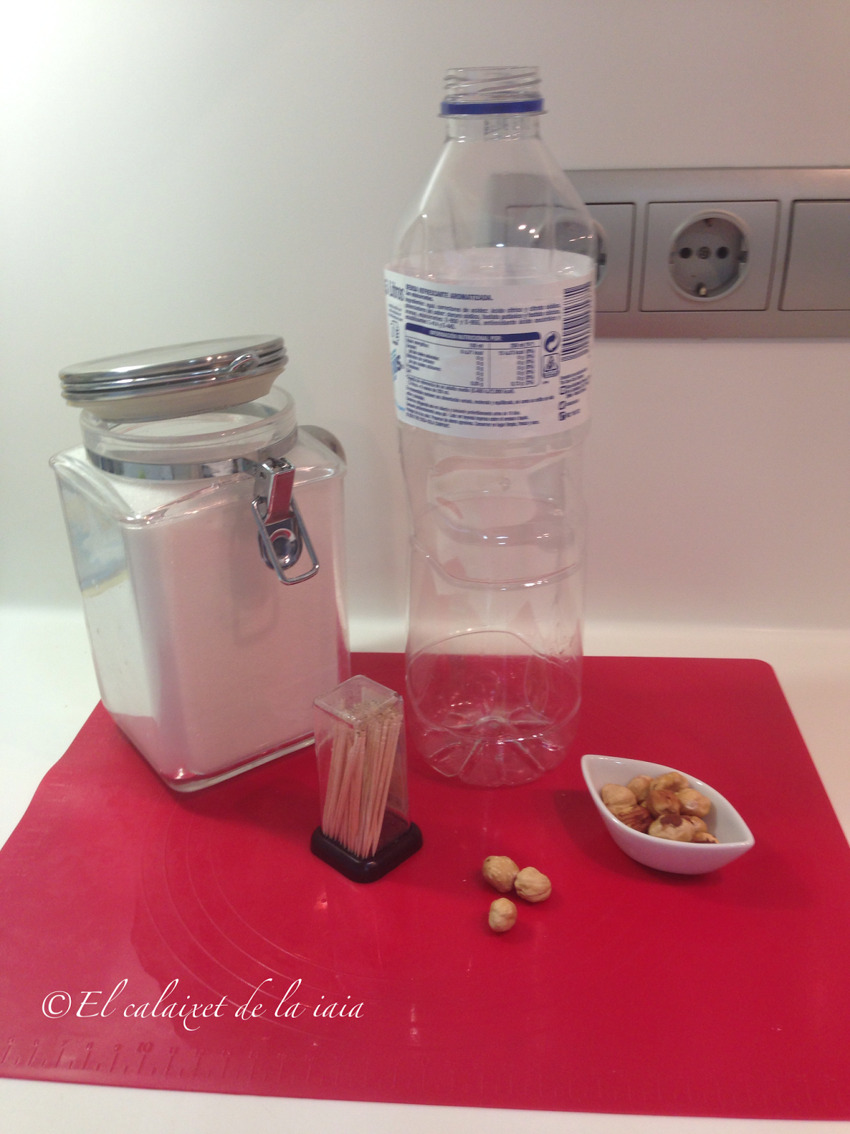 y los colocaremos en los agujeros de la botella o brik que tendremos colocada sobre la manta de látex o papel sulfurizado de horno, también podremos hacer figuras con el chorro del caramelo que cae de la avellana sobre la manta, como espirales o lo que nuestra imaginación nos diga, después las despegaremos con cuidado, sacaremos el palillo de la avellana con delicadeza y
