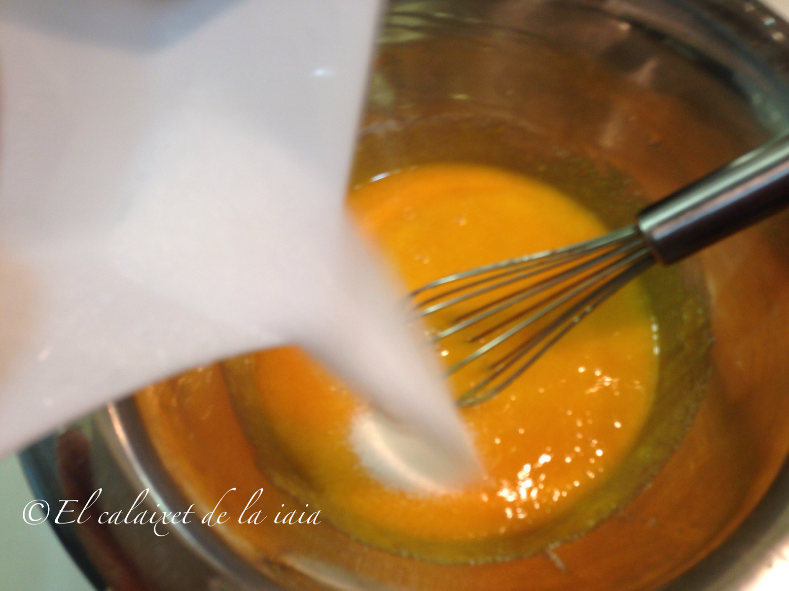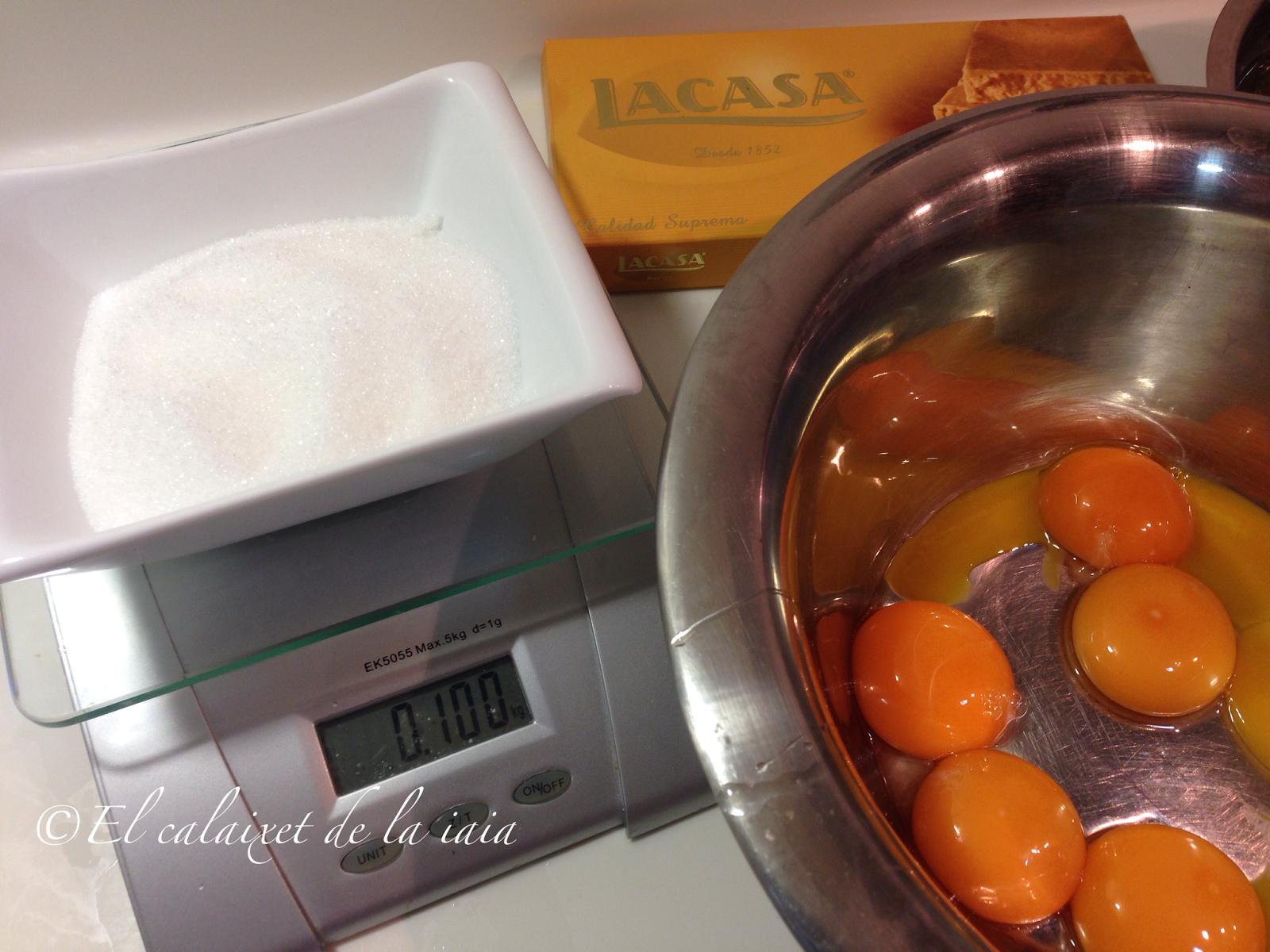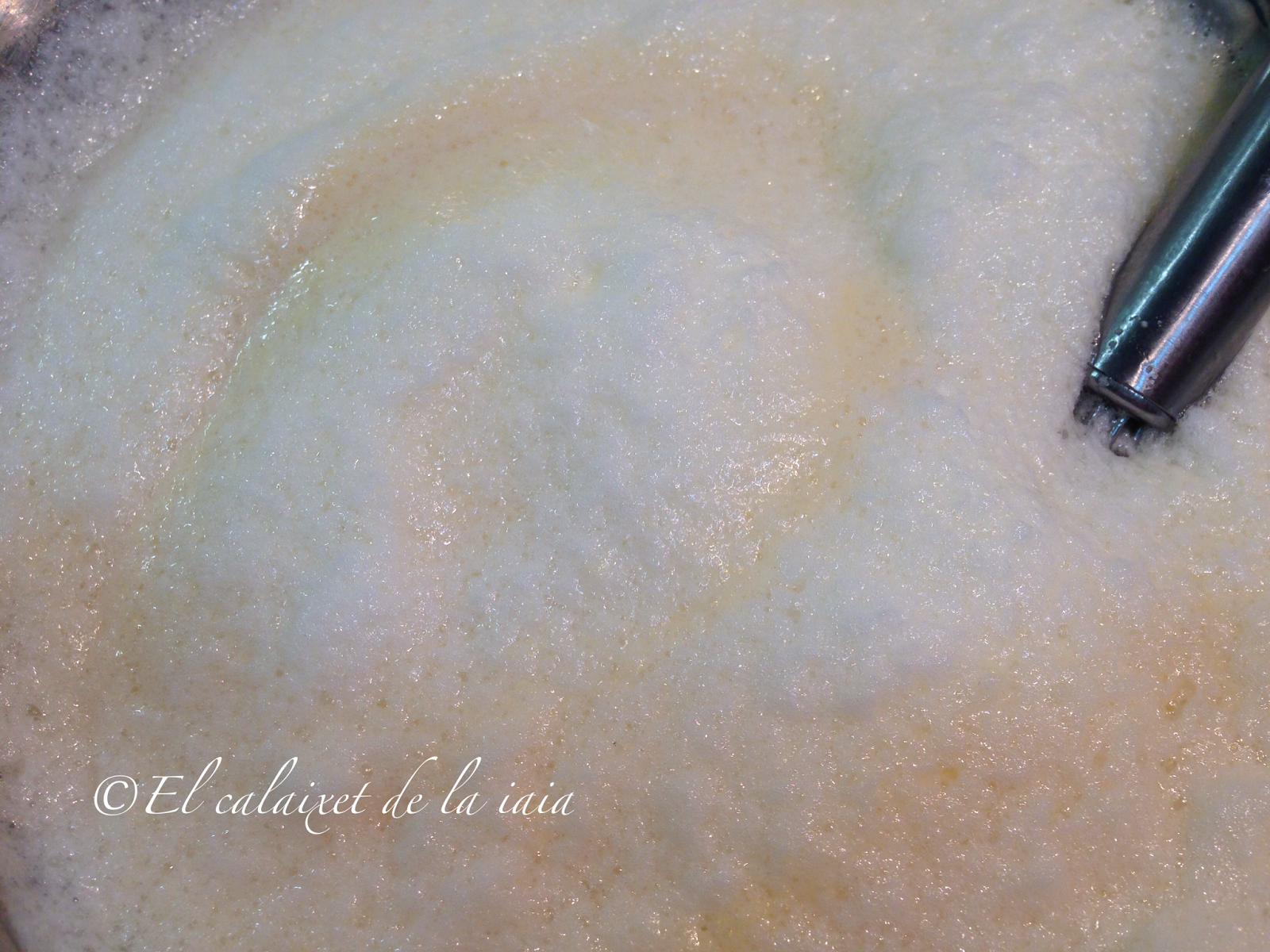 añadiremos a las yemas 100g de azúcar y batimos hasta blanquear
