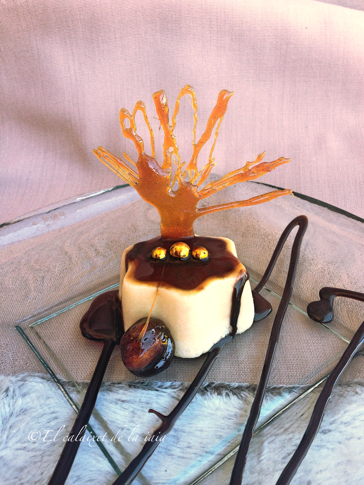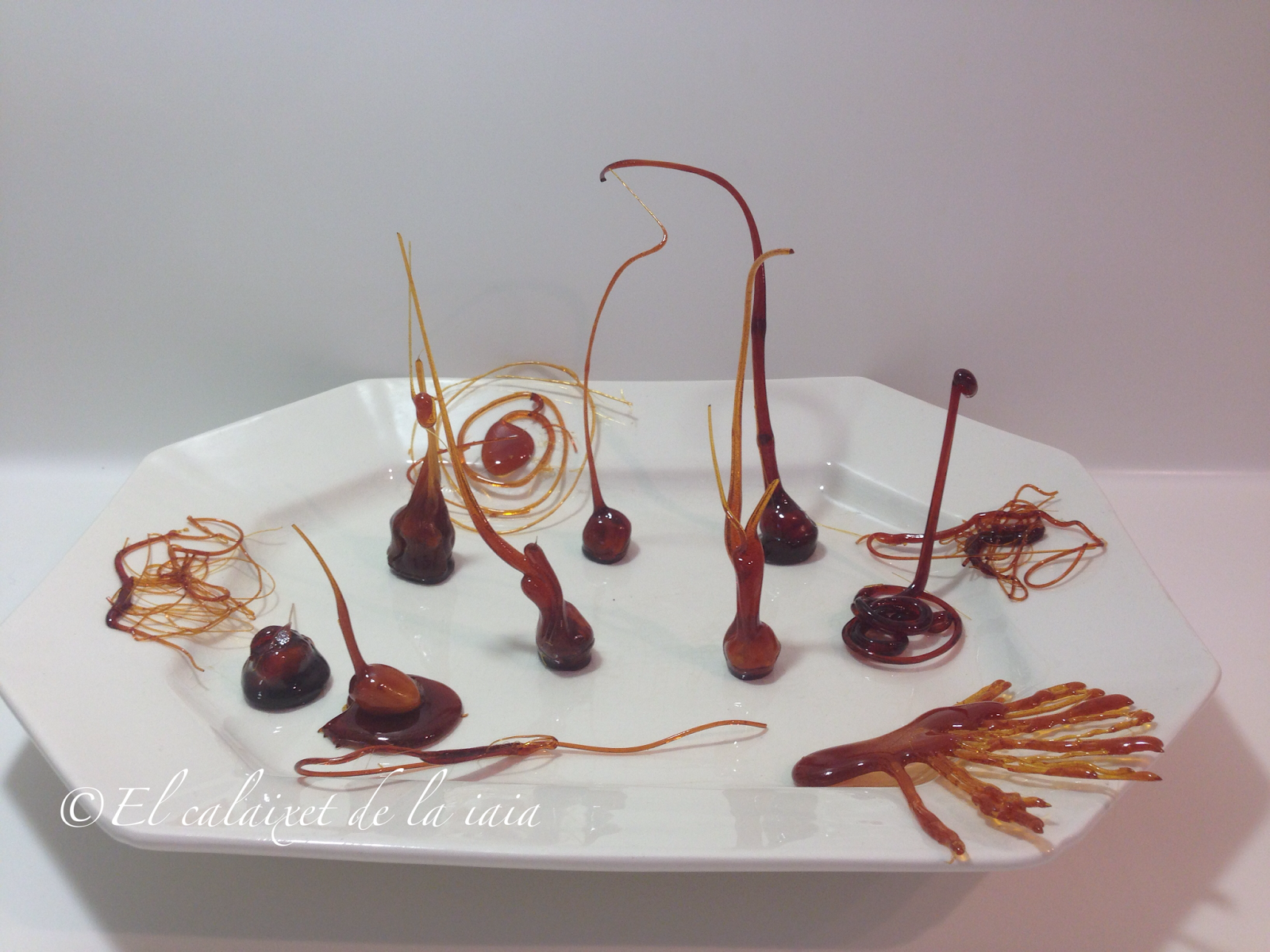 Prepararemos primero unas figuritas con azúcar quemado solo o con unas avellanas, según nuestra inspiración del momento, para ello haremos un caramelo y hacemos dibujos sobre un mantel de silicona, papel sulfurizado o de horno y reservamos.