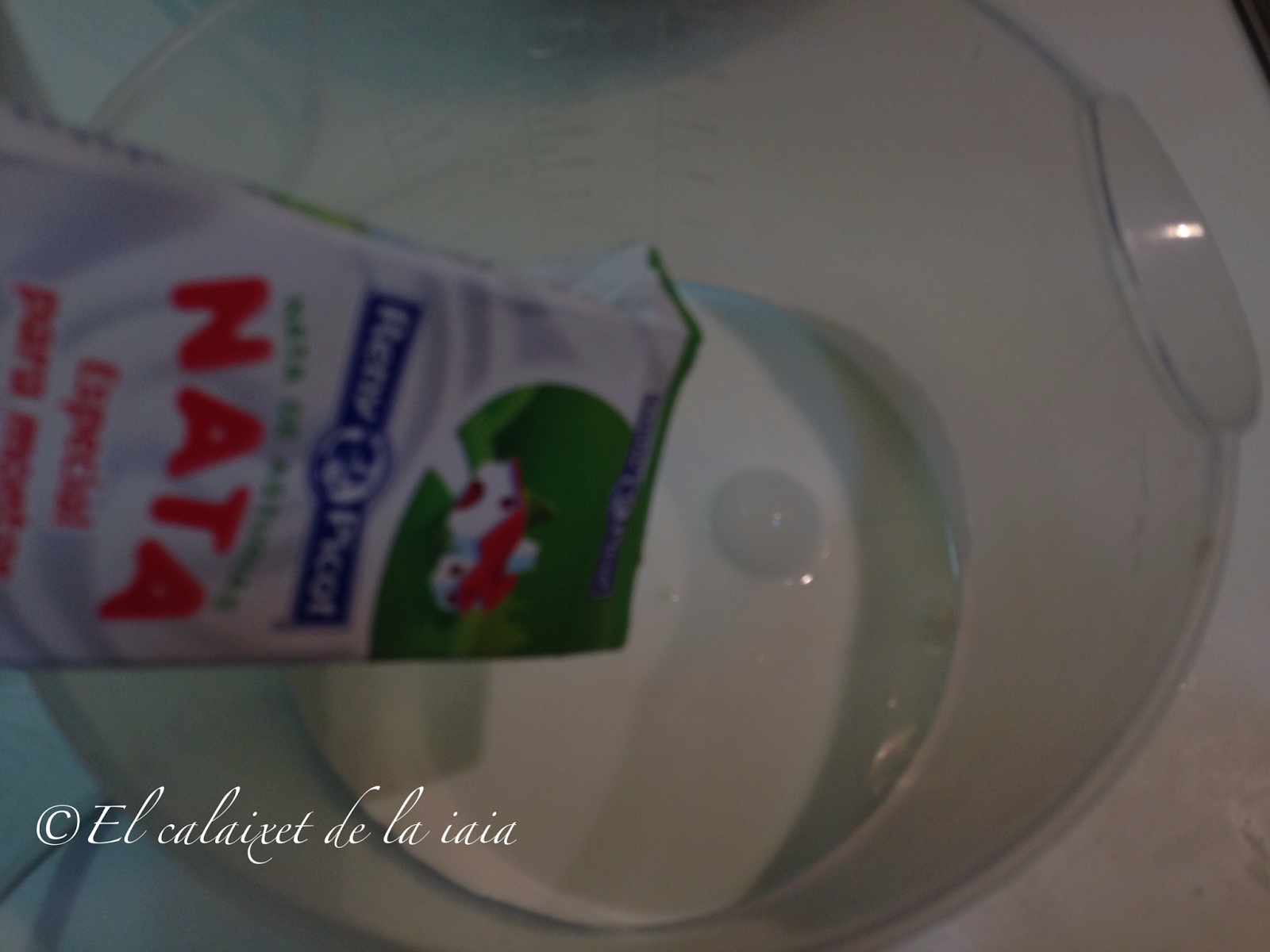 Montamos la nata con 50g de azúcar y montamos con la crema de yemas con movimientos envolventes