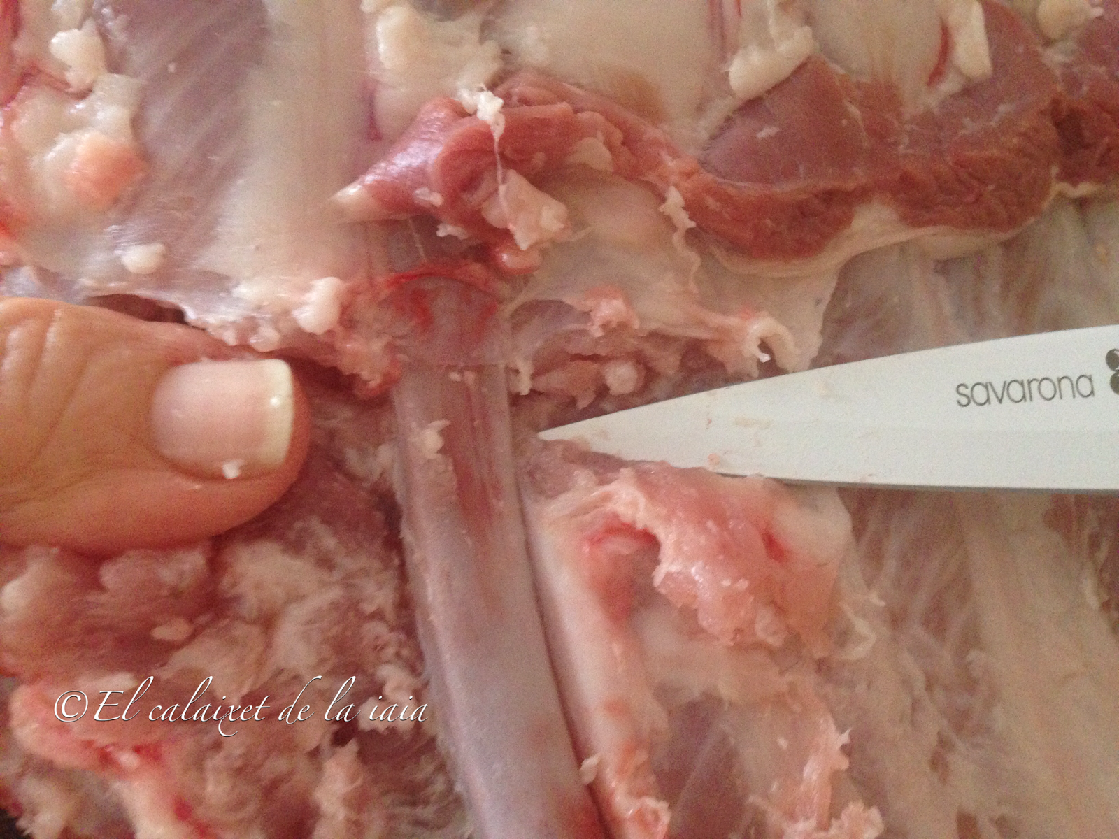 Con cuidado iremos cortando la carne da cada costilla hasta llegar al hueso, y cortaremos también la zona más pegada al mismo, tiraremos y veremos como se despega fácilmente, separándose por completo