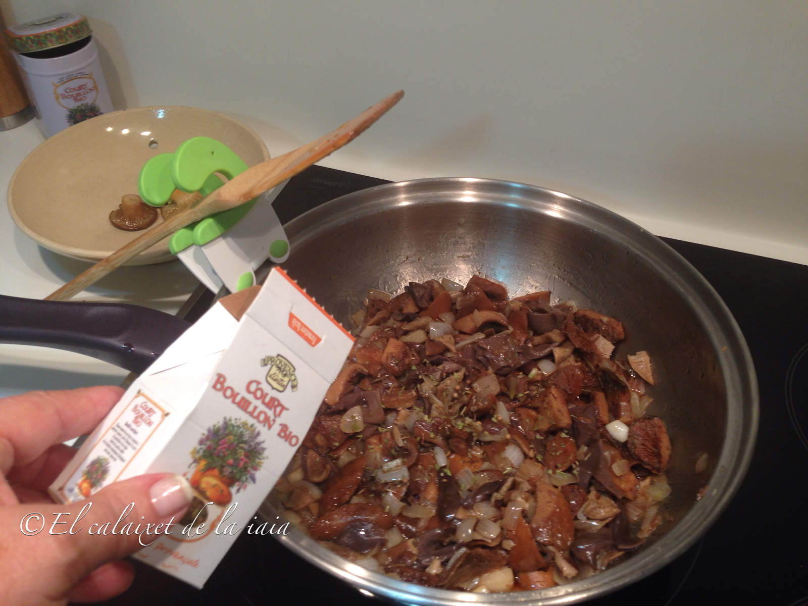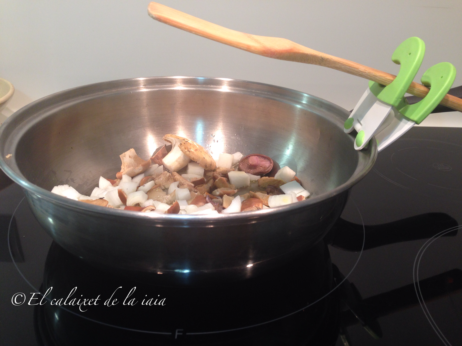 limpiamos y troceamos las setas dejando algunas enteras para decorar el plato en la presentación, una de las cebollas y dos dientes de ajo muy picaditos, y la ponemos a pochar en aceite de oliva