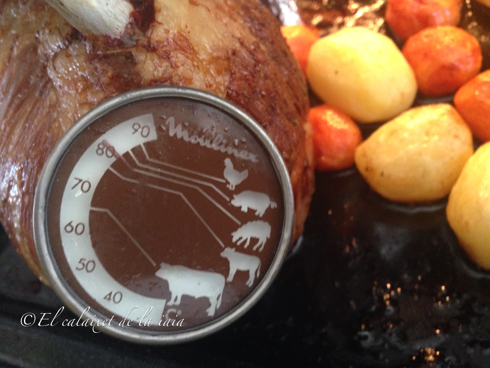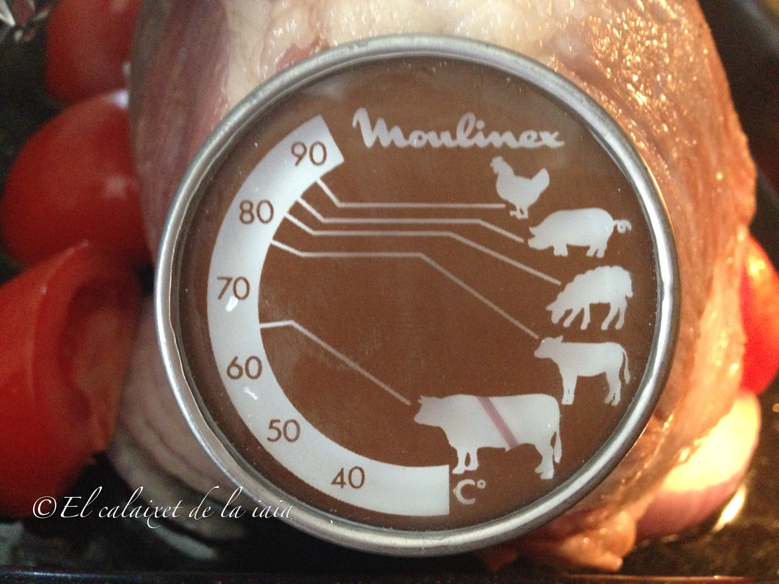 Si tenéis termómetro de horno, no dudéis en usarlo, este mío tiene muuuchos años y no da los grados, pero con uno de grados tendréis la carne lista cuando marque el relleno del interior 80º, que como os decía antes, son dos horas de mi horno a 180º