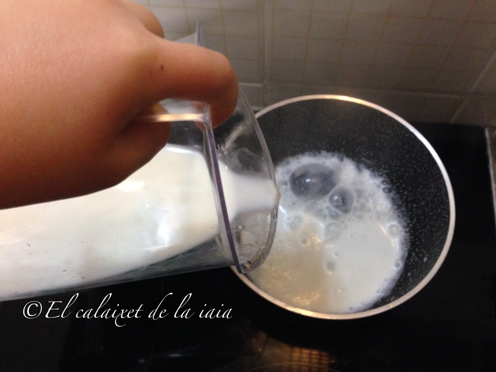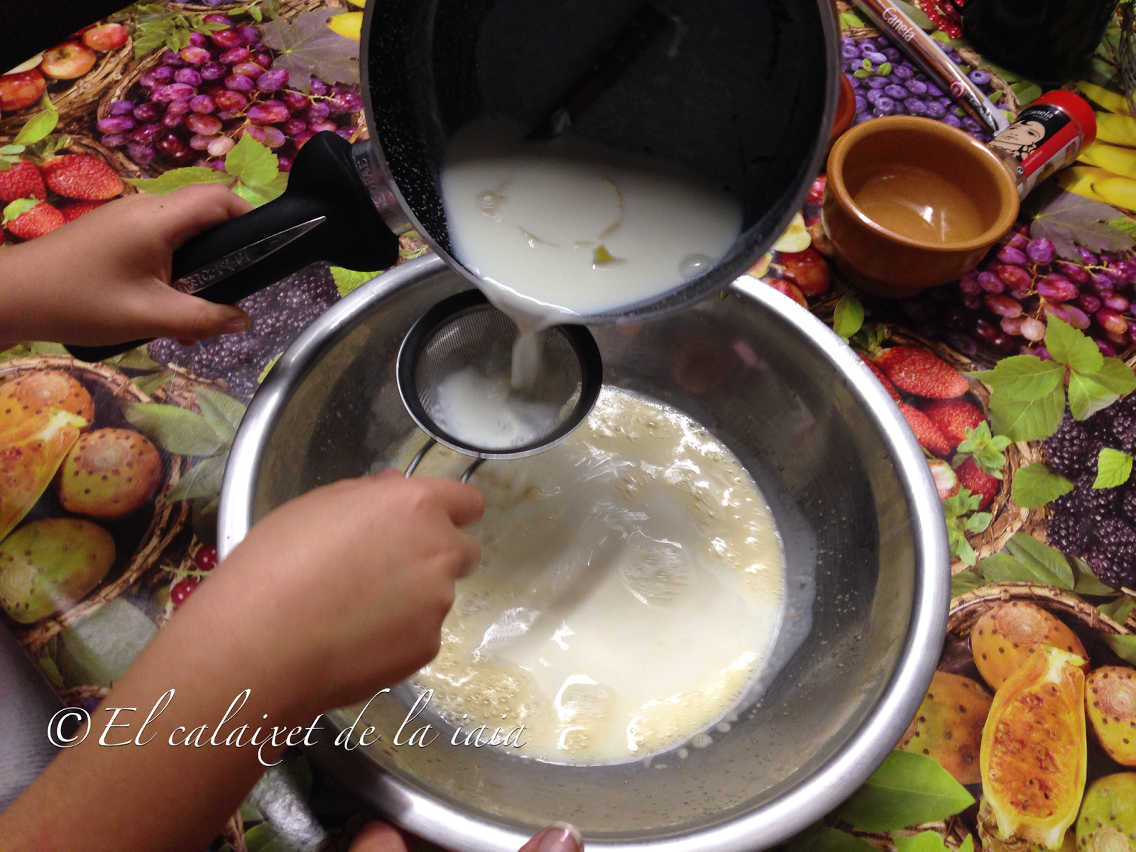 y la leche que ya no estará caliente (ésto es importante porque de lo contrario nos cuajará el huevo) colándola previamente