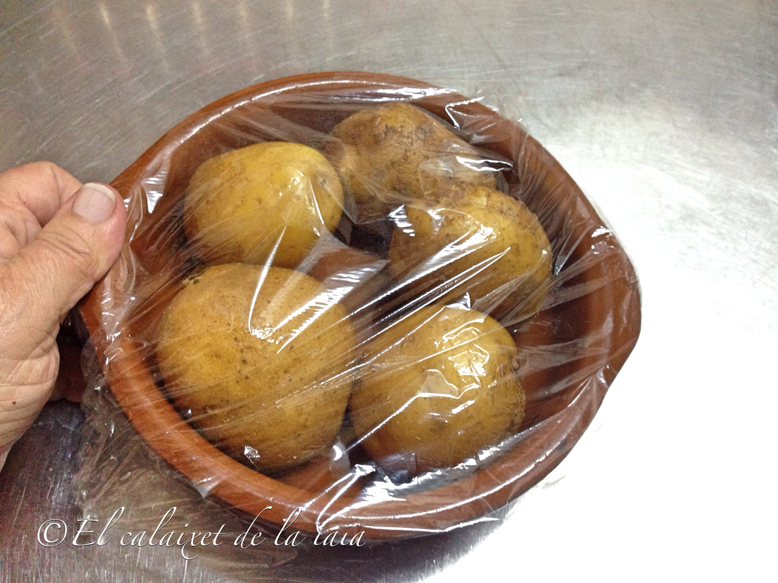una vez cocidas las patatas, las dejaremos un ratito con el papel film para que resuden y sea más fácil aún pelarlas