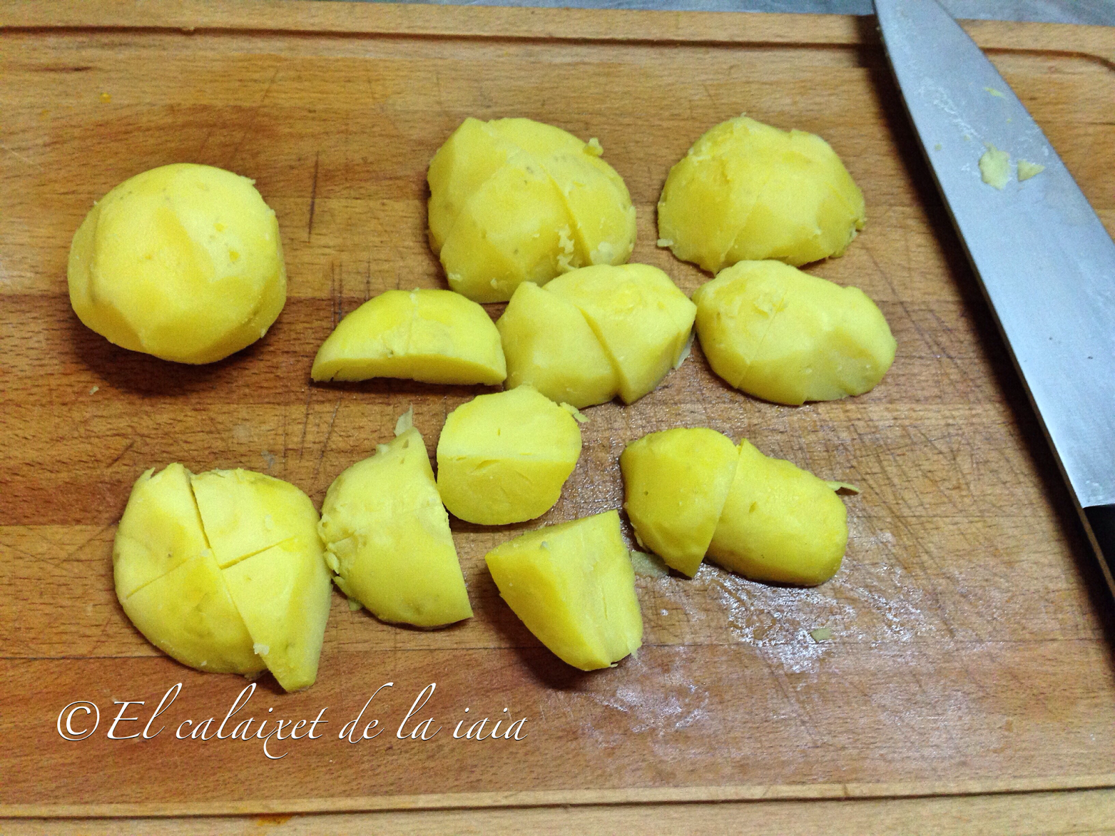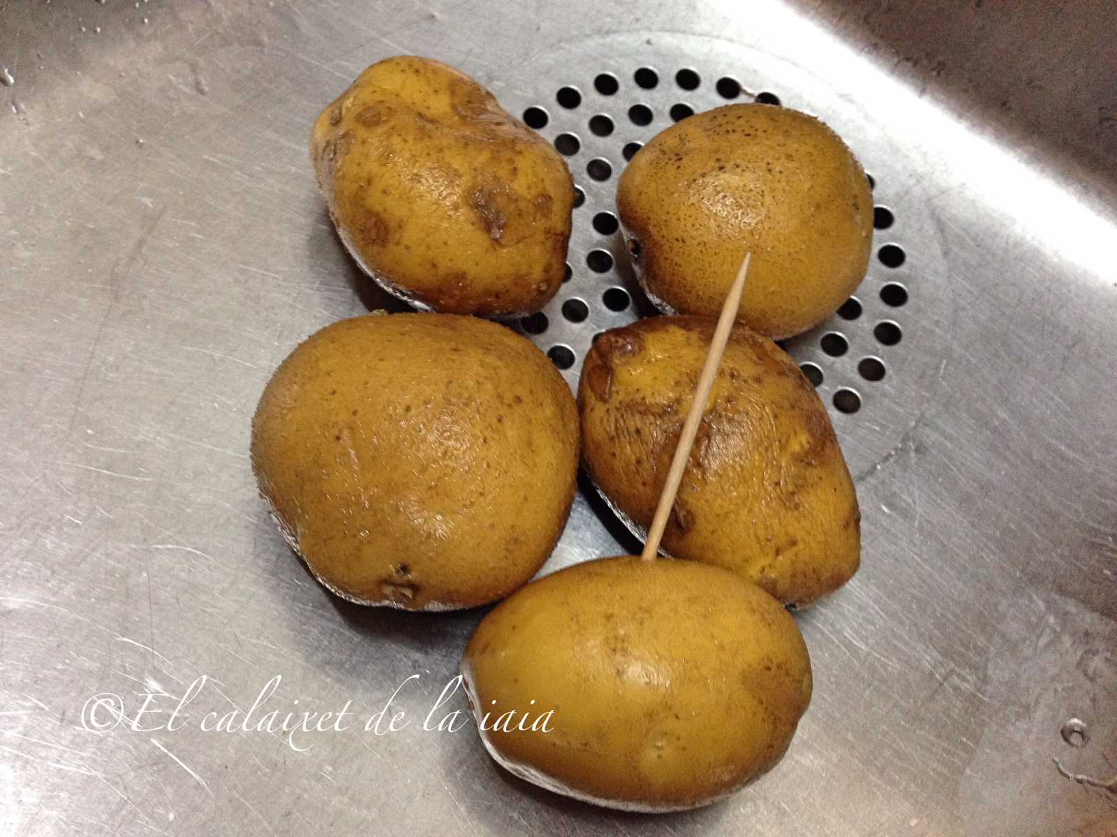 pelamos las patatas tirando de la piel por los dos extremos y saldrá en dos piezas, debido al corte que hemos hecho antes de cocerlas ??y las troceamos a nuestro gusto. Las incorporamos a la salsa, removemos y retiramos del fuego, reservando.