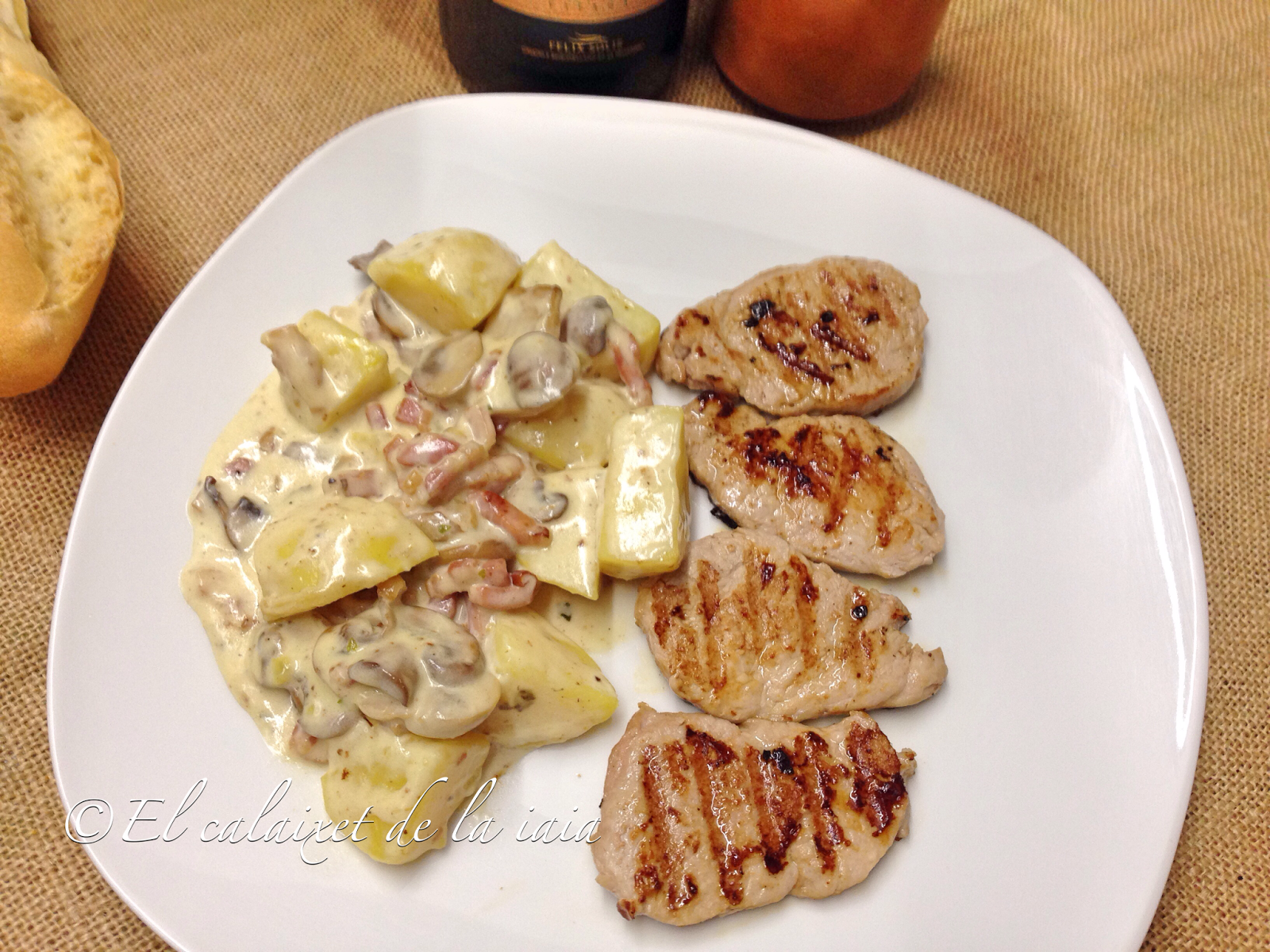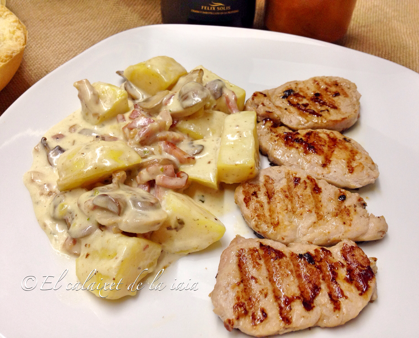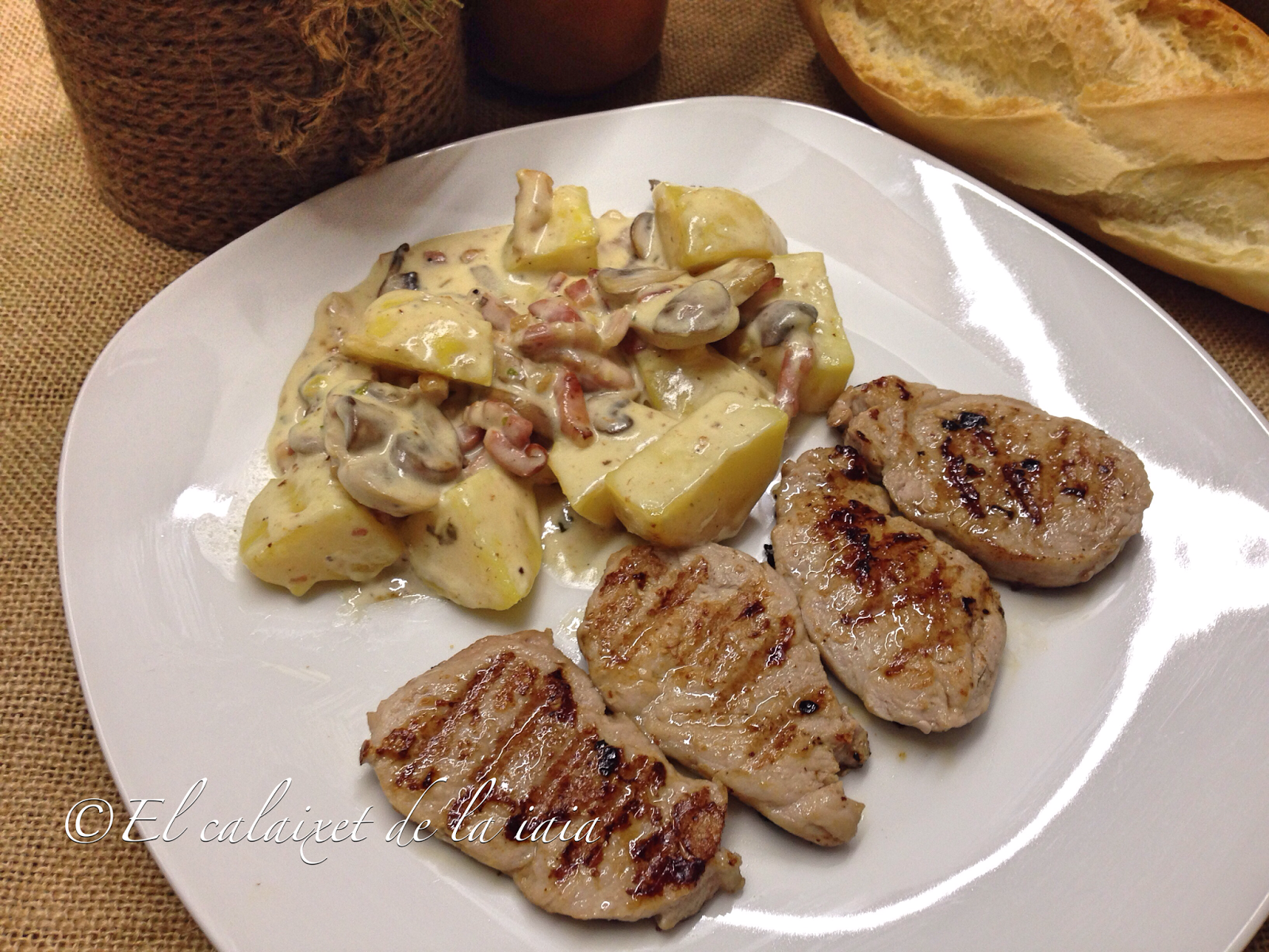 Hoy las he preparado con una salsa tipo carbonara, aunque con nata,( la carbonara no lleva nata) se puede sustituir la nata por leche evaporada y el beicon por taquitos de jamón de york, así será un plato menos calórico, también añado champiñones, que hace que resulte un plato muy bueno, y las he usado como guarnición de un solomillo a la plancha, aunque perfectamente se pueden presentar como plato en lugar de guarnición, porque son muy ricas y muy completas.