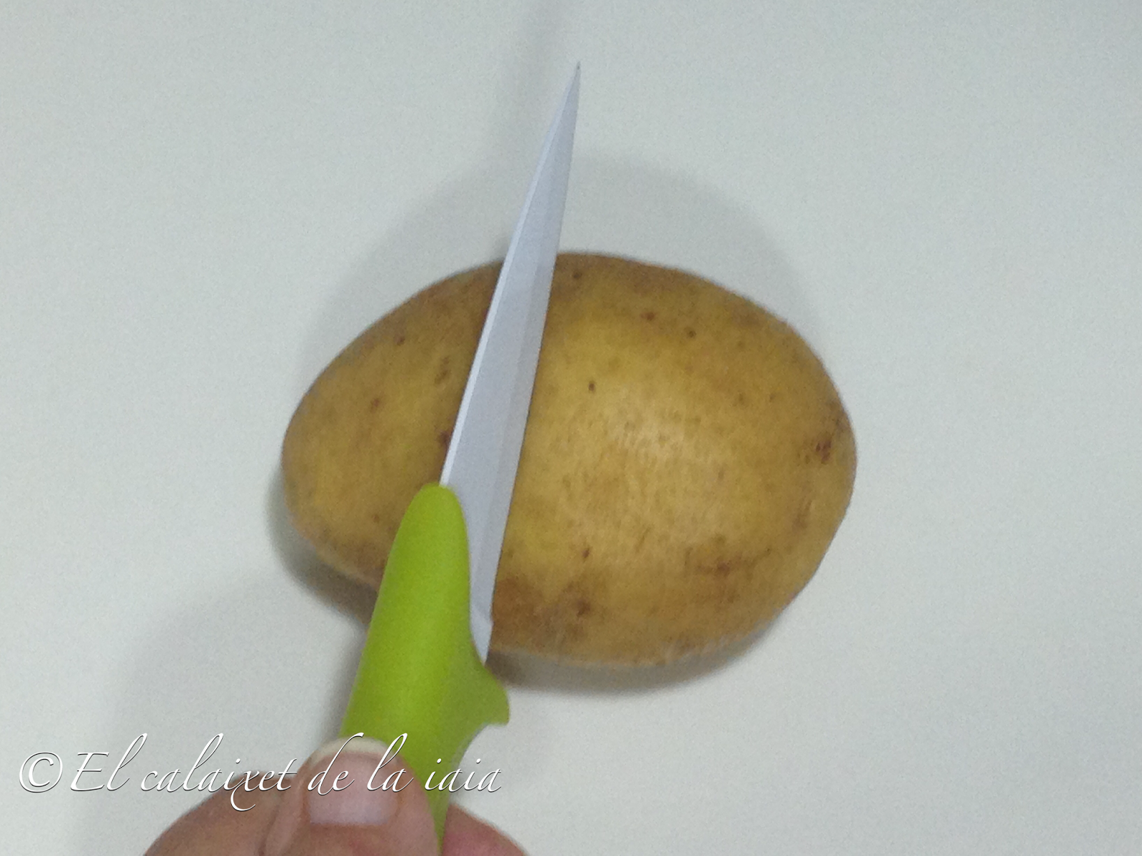 Lavamos las patatas y las pinchamos con un palillo para que no exploten ya que las vamos a cocer con la piel en el microondas, para facilitar el trabajo de pelarlas solo hace falta hacer un corte en la piel por la mitad de la patata haciendo una circunferencia